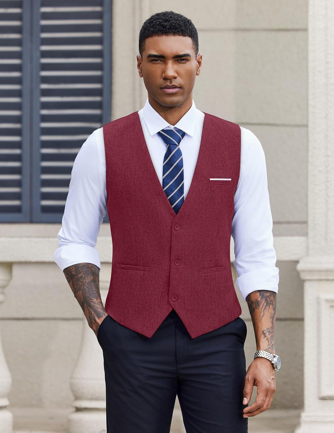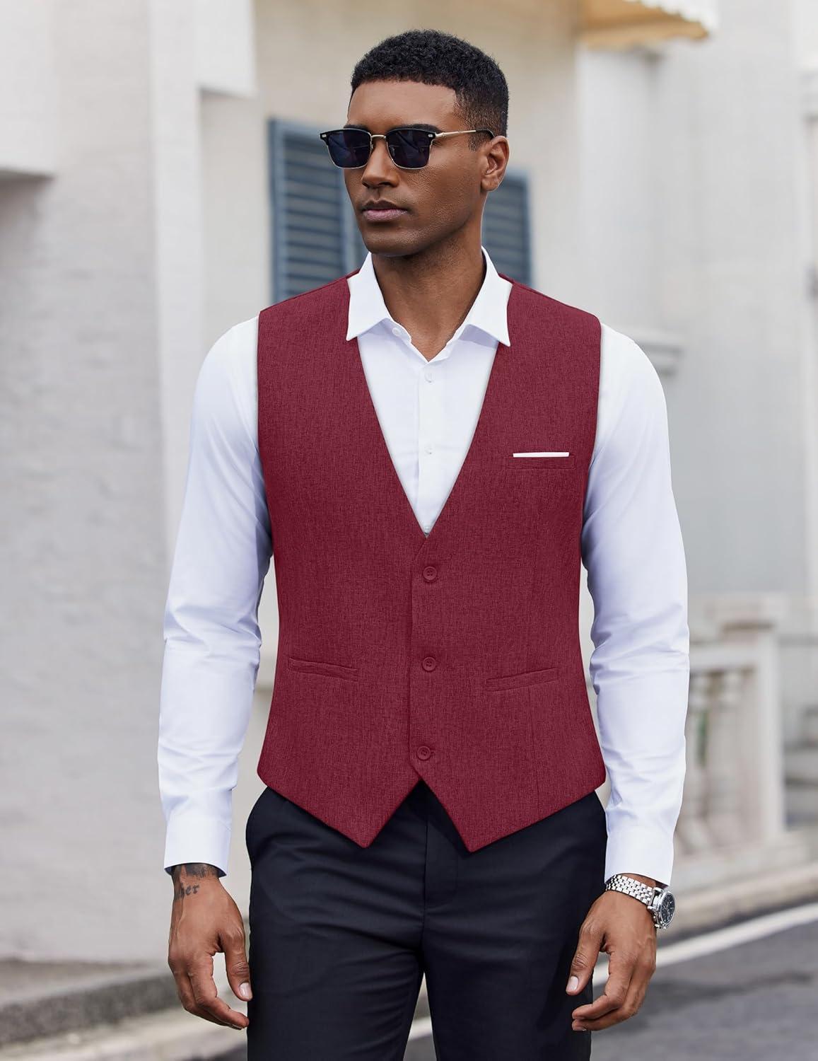 COOFANDY Men’s Suit Vest Slim Fit Casual Business Vests Lightweight V-Neck Formal Dress Waistcoat for Wedding Prom(Wine Red)