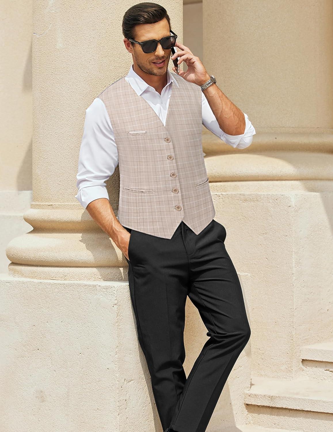 COOFANDY Men’s Suit Vest Slim Fit Business Formal Waistcoat Casual Dress Vest(Plaid Khaki)
