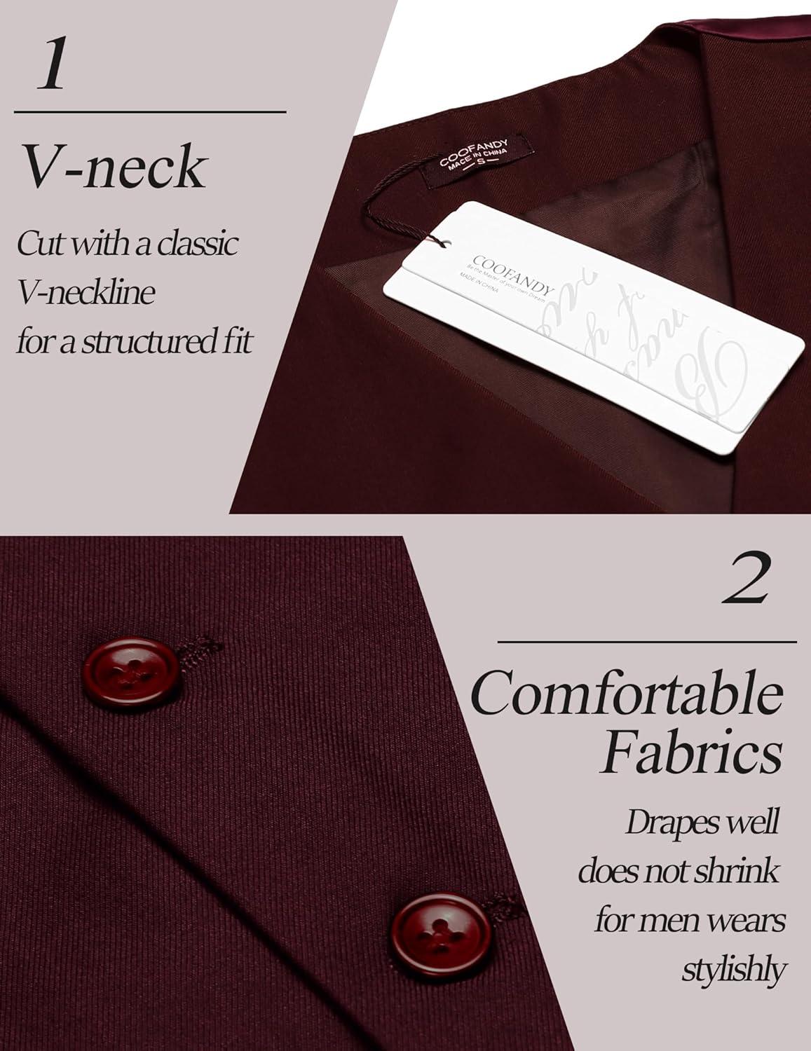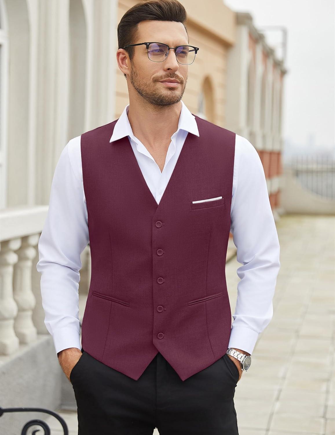 COOFANDY Men’s Suit Vest Slim Fit Casual Business Vests Lightweight V-Neck Formal Dress Waistcoat for Wedding Prom(Wine Red)