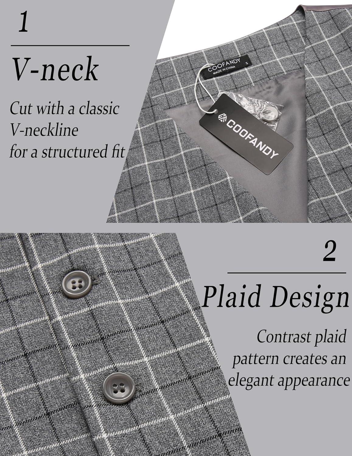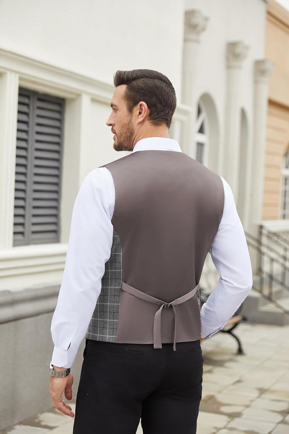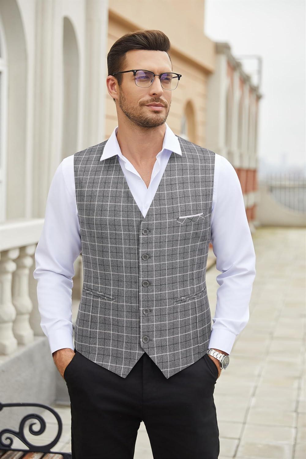 COOFANDY Men’s Suit Vest Slim Fit Business Formal Waistcoat Casual Dress Vest(Plaid Grey)