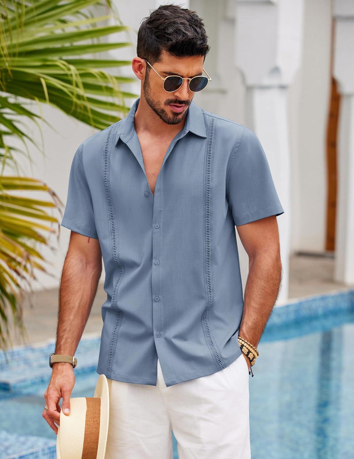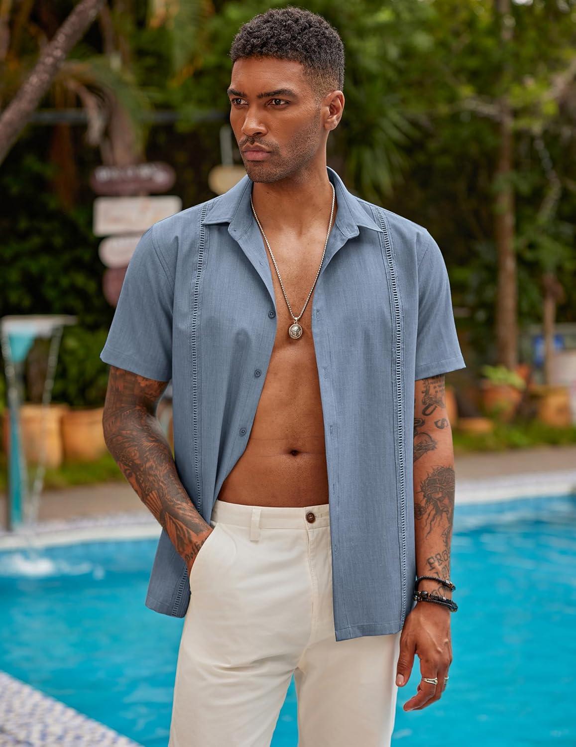 COOFANDY Men’s Cuban Guayabera Shirts Casual Long Sleeve Button Down Shirts Band Collar Linen Summer Beach Shirts(Denim Blue)