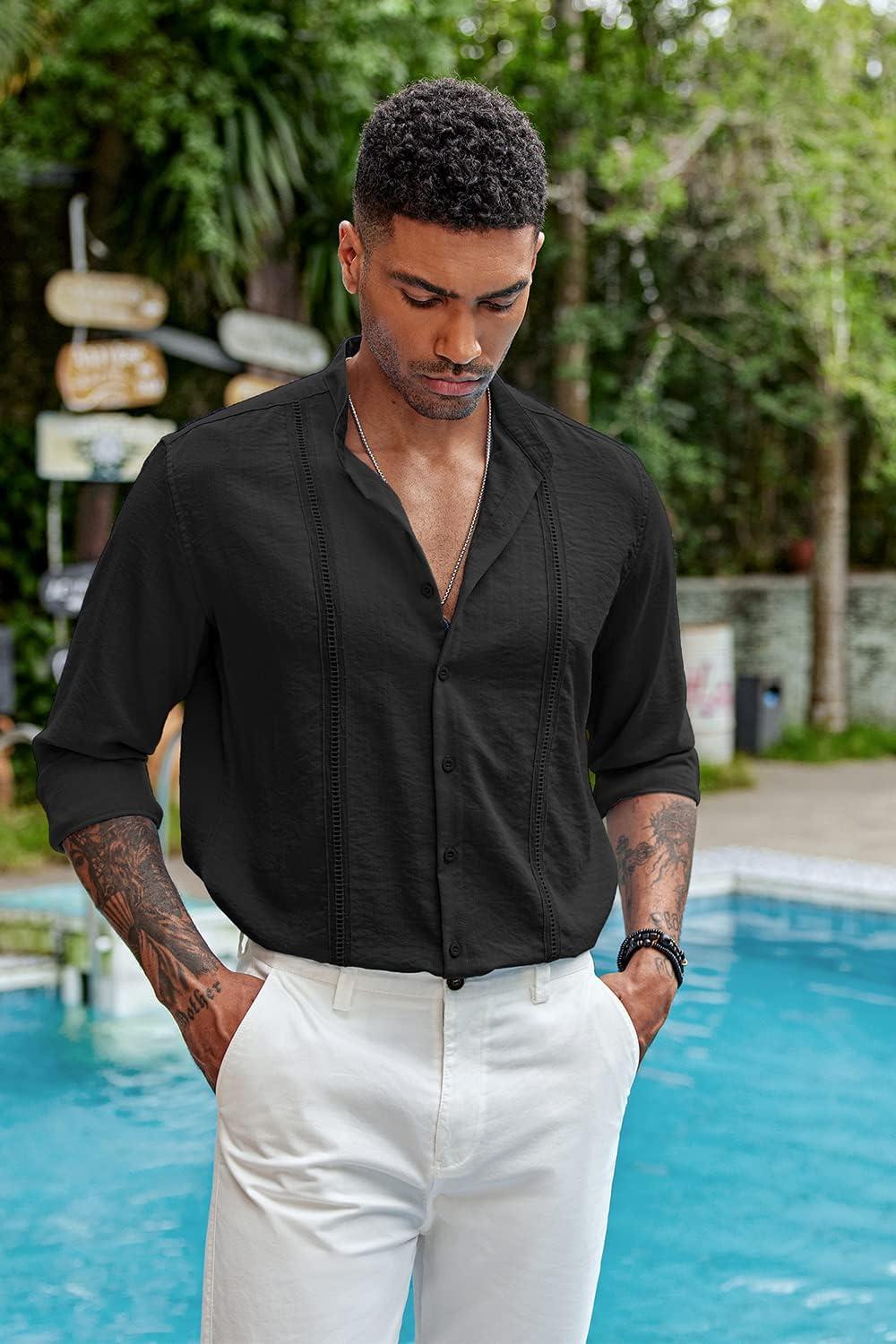 COOFANDY Men’s Cuban Guayabera Shirts Casual Long Sleeve Button Down Shirts Band Collar Linen Summer Beach Shirts(Black)
