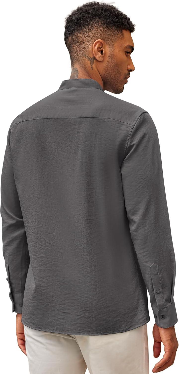 COOFANDY Men’s Cuban Guayabera Shirts Casual Long Sleeve Button Down Shirts Band Collar Linen Summer Beach Shirts(Dark Grey)