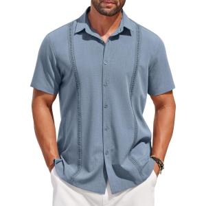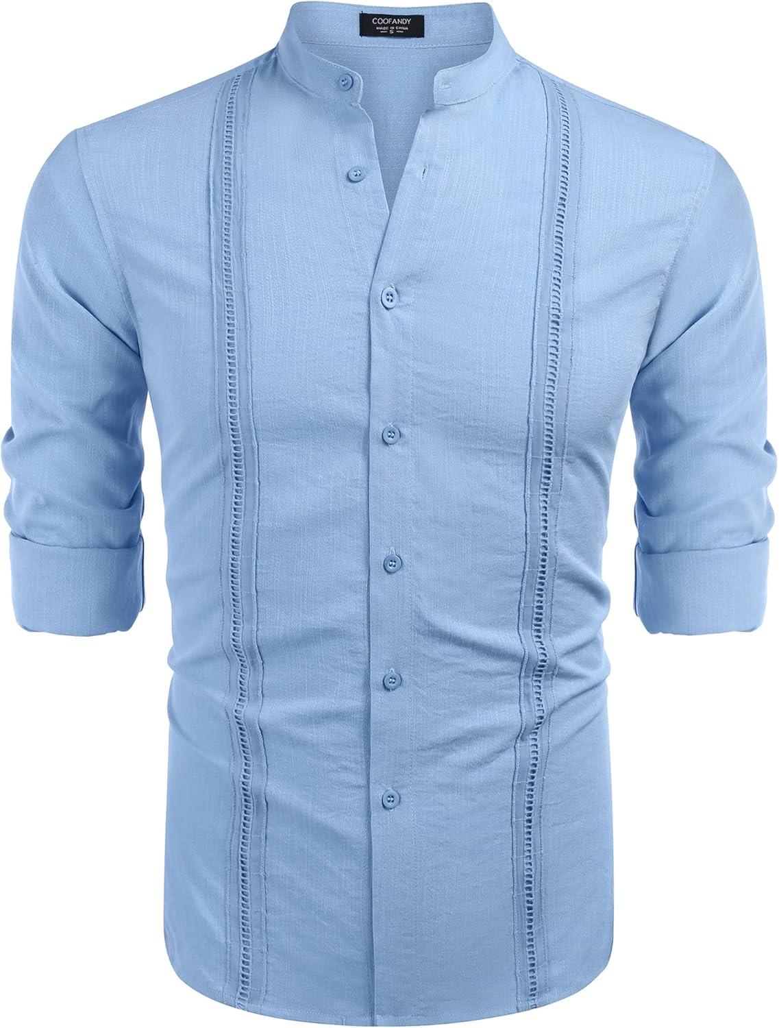 COOFANDY Men’s Cuban Guayabera Shirts Casual Long Sleeve Button Down Shirts Band Collar Linen Summer Beach Shirts(A-blue)