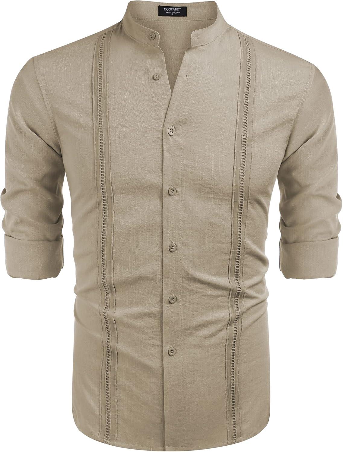COOFANDY Men’s Cuban Guayabera Shirts Casual Long Sleeve Button Down Shirts Band Collar Linen Summer Beach Shirts(Khaki)