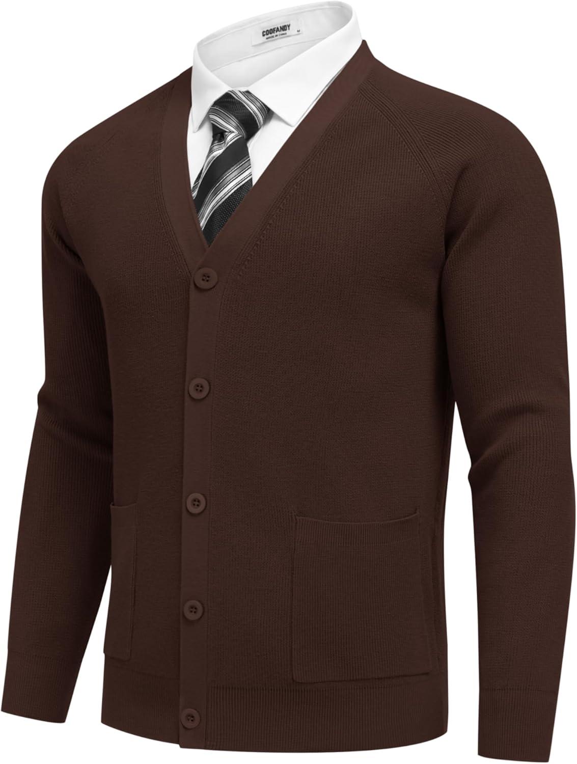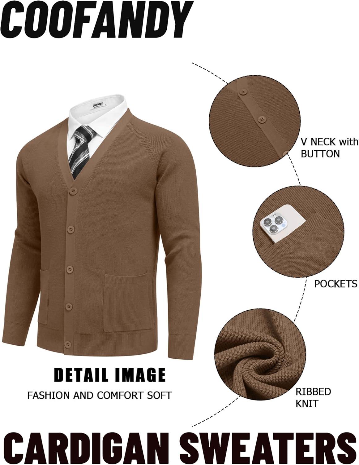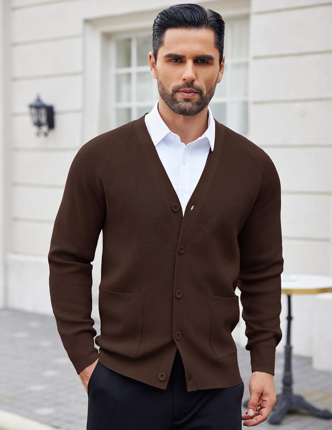 COOFANDY Men’s Cardigan Sweaters with Button Lightweight Casual V Neck Long Sleeve Pockets Knitted Sweater(Brown)