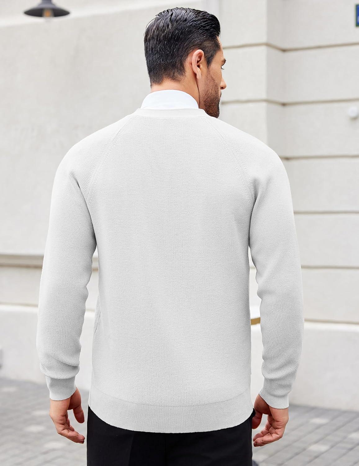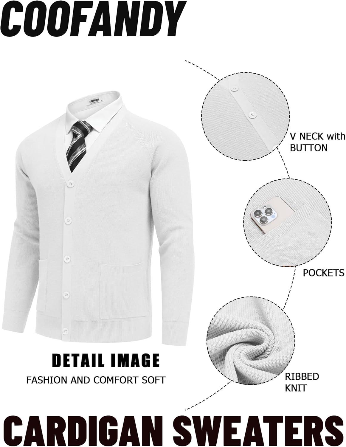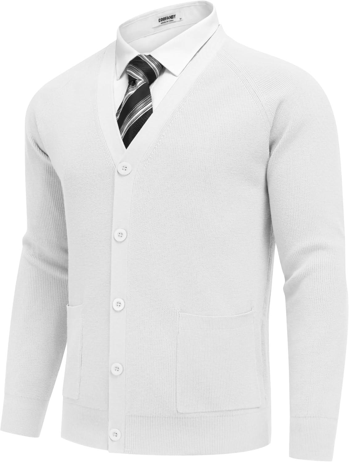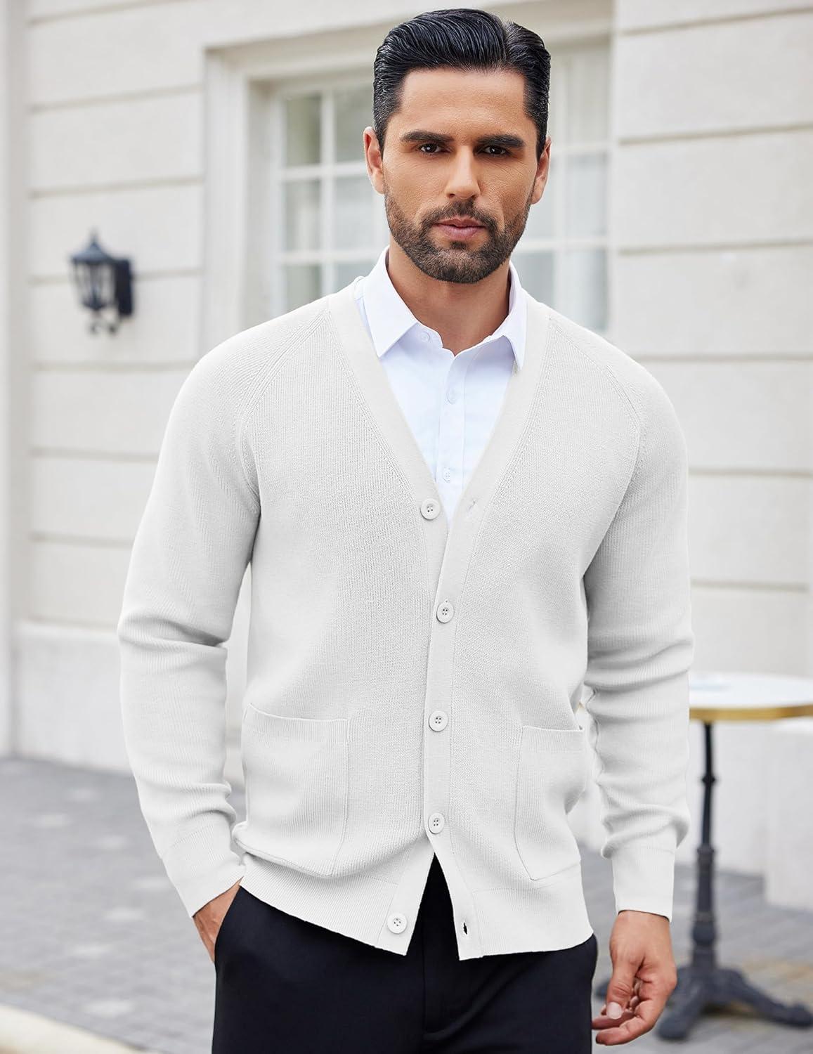 COOFANDY Men’s Cardigan Sweaters with Button Lightweight Casual V Neck Long Sleeve Pockets Knitted Sweater(White)