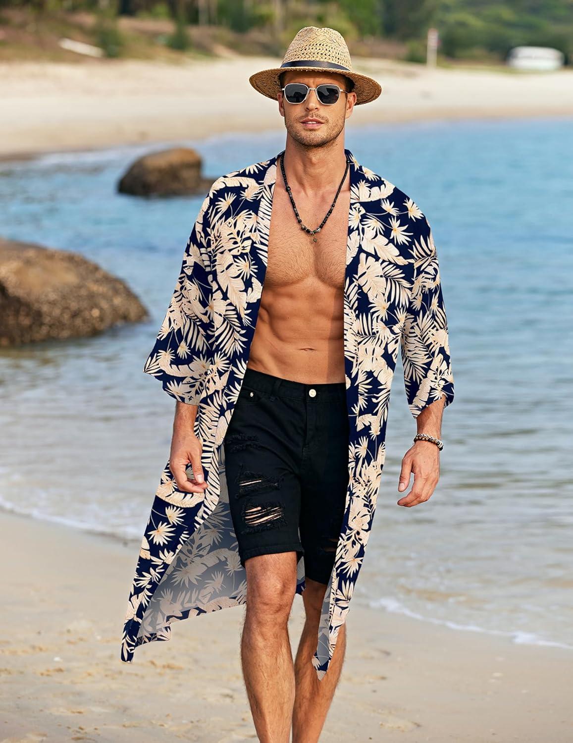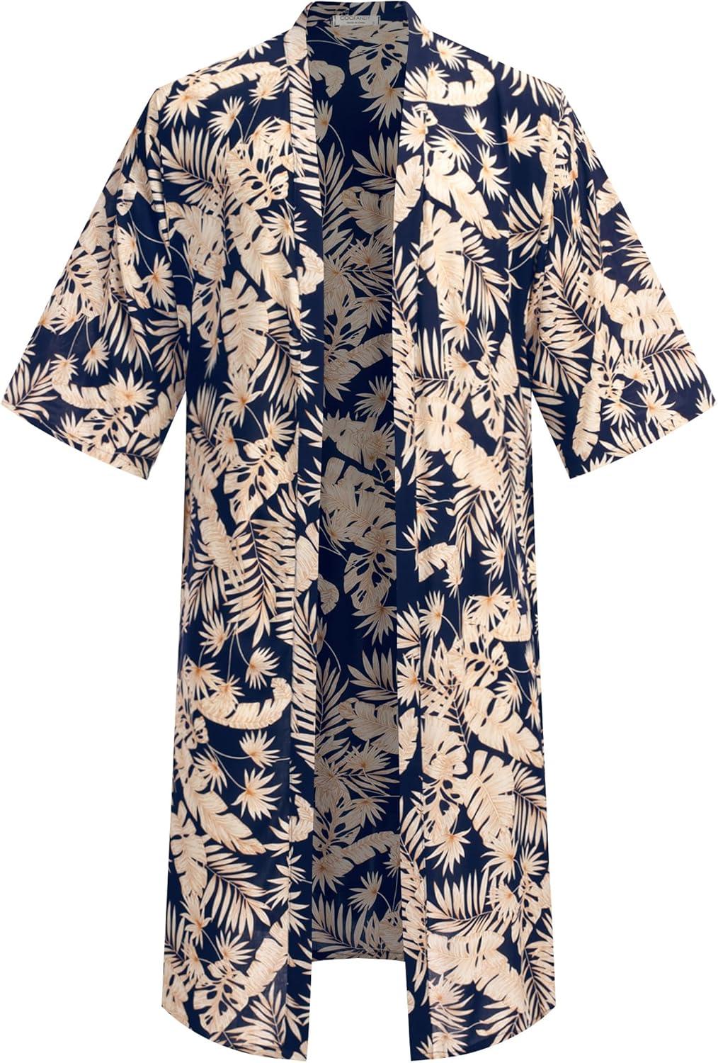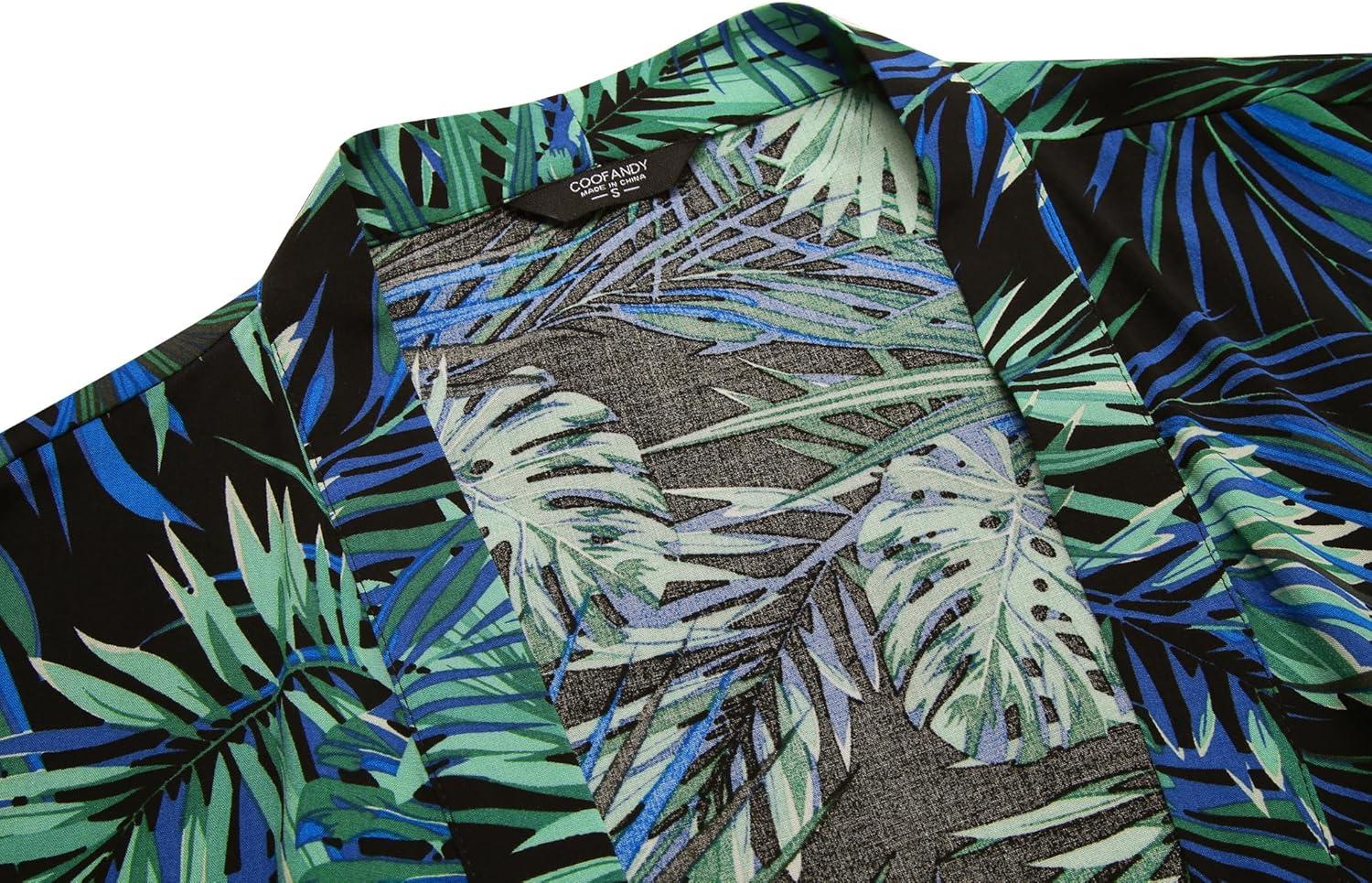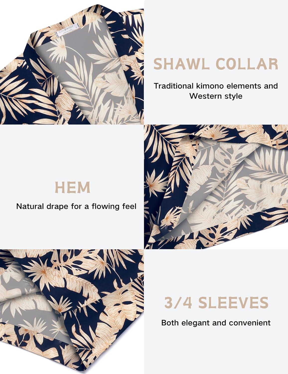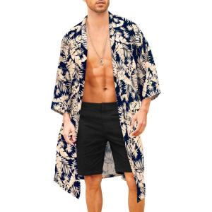 COOFANDY Men’s Lightweight Kimono Robe Jacket Printed Japanese Style Bathrobes Casual Open Front Long Cardigan Coat Outwear(Navy(khaki Leaves))