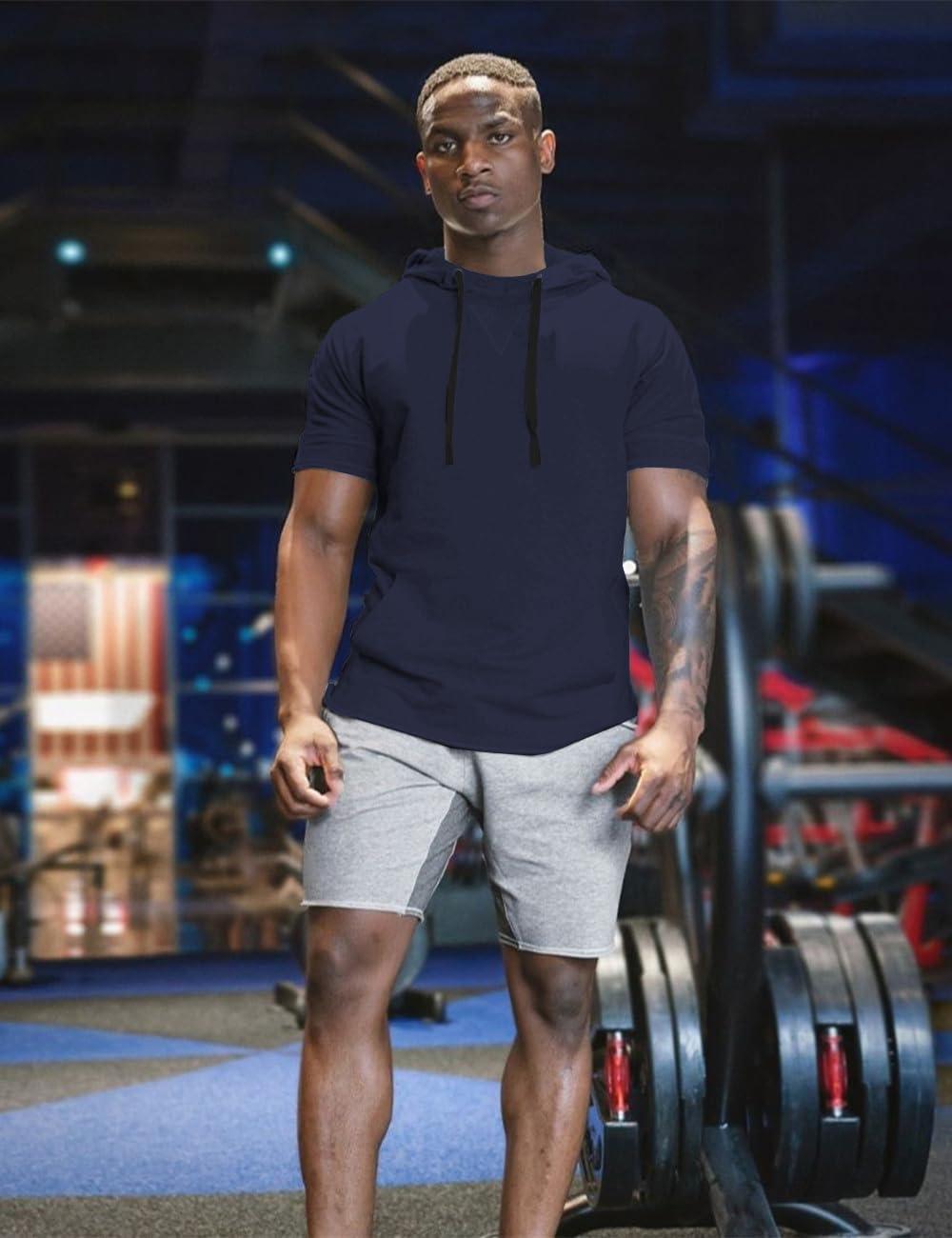 COOFANDY Men’s Short Sleeve Hoodie Workout Gym Sweatshirt Muscle Fit Fashion Athletic Hoodies Pullover Cotton Hooded T-Shirts(Navy Blue)