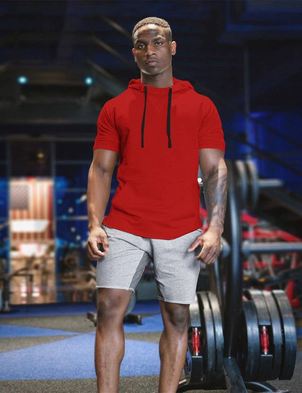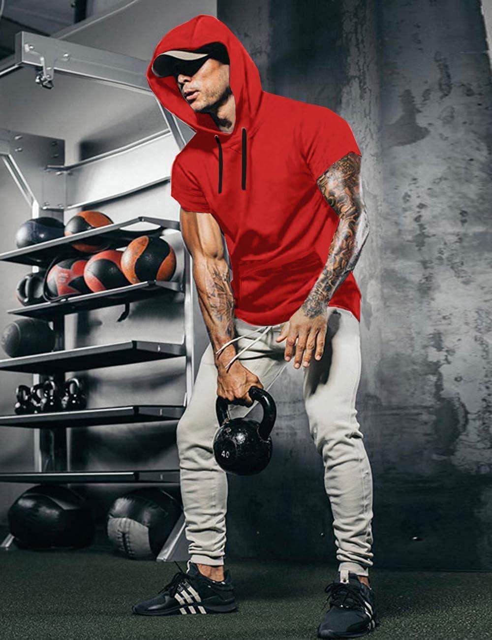 COOFANDY Men’s Short Sleeve Hoodie Workout Gym Sweatshirt Muscle Fit Fashion Athletic Hoodies Pullover Cotton Hooded T-Shirts(Red)