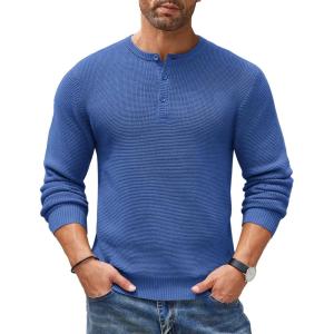 COOFANDY Men’s Henley Knit Sweater Long Sleeve Button Pullover Sweater Casual Waffle Texture Fashion Henley Sweater(Blue)