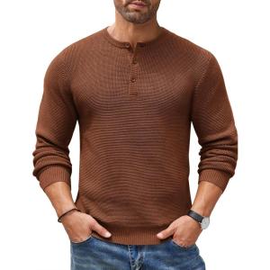 COOFANDY Men’s Henley Knit Sweater Long Sleeve Button Pullover Sweater Casual Waffle Texture Fashion Henley Sweater(Caramel Beige)