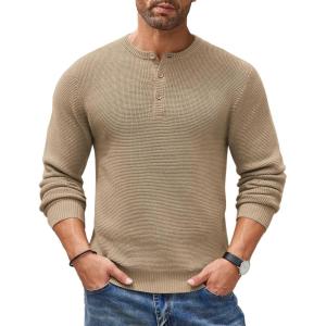 COOFANDY Men’s Henley Knit Sweater Long Sleeve Button Pullover Sweater Casual Waffle Texture Fashion Henley Sweater(Khaki)