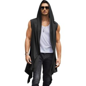 COOFANDY Men’s Long Hooded Cardigan Sleeveless Ruffle Shawl Collar Lightweight Open Front Drape Kimono Vest(Black)
