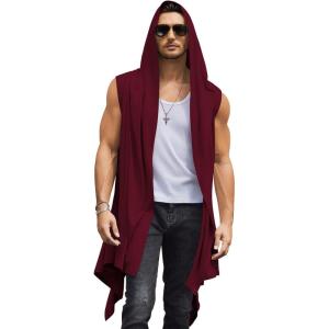 COOFANDY Men’s Long Hooded Cardigan Sleeveless Ruffle Shawl Collar Lightweight Open Front Drape Kimono Vest(Dark Red)