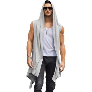 COOFANDY Men’s Long Hooded Cardigan Sleeveless Ruffle Shawl Collar Lightweight Open Front Drape Kimono Vest(Light Grey)