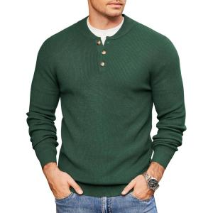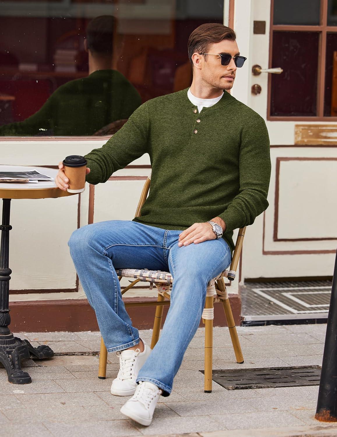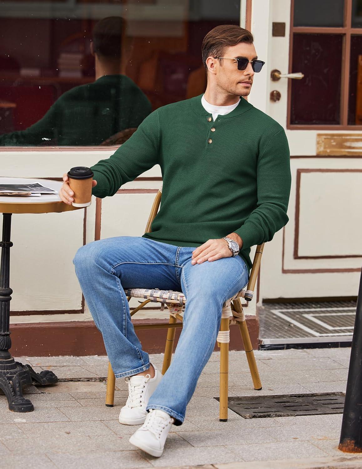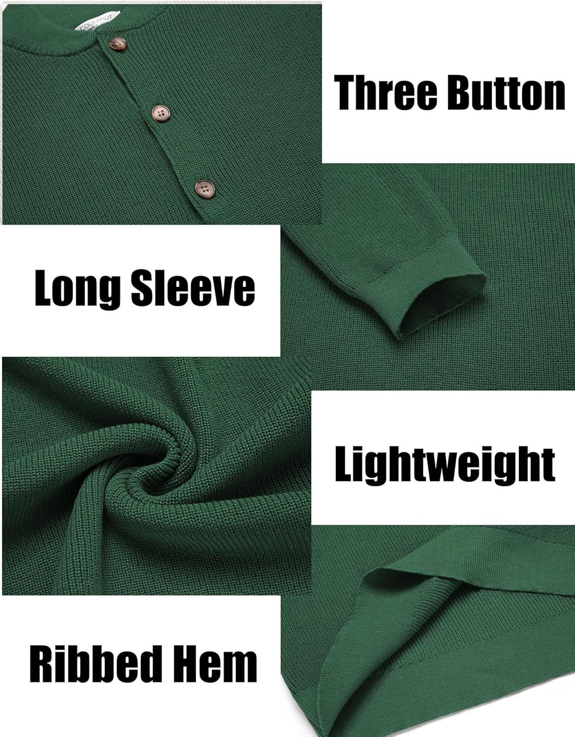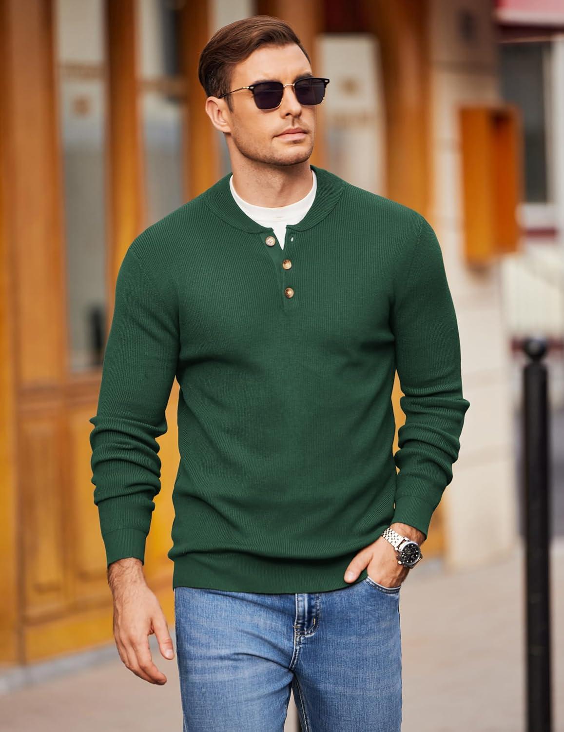 COOFANDY Men Henley Knit Sweater Dress Long Sleeve Button Pullover Sweater Casual Sweater Lightweight Slim Fit Tops(Green)
