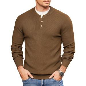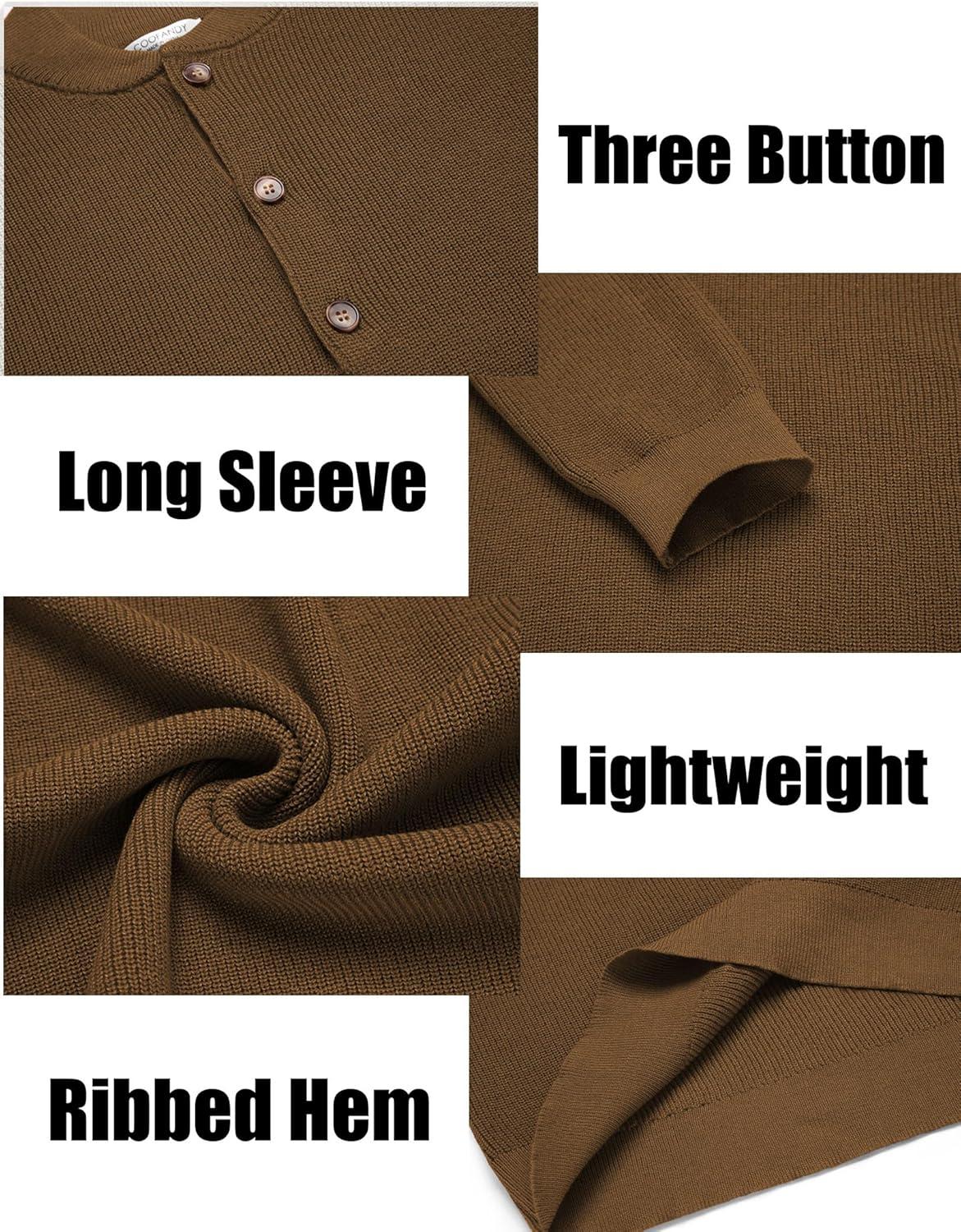 COOFANDY Men Henley Knit Sweater Dress Long Sleeve Button Pullover Sweater Casual Sweater Lightweight Slim Fit Tops(Brown)