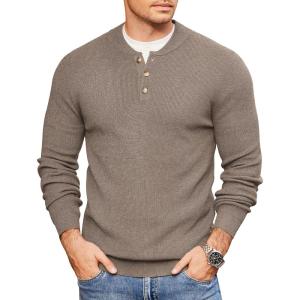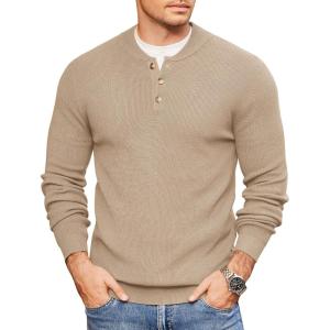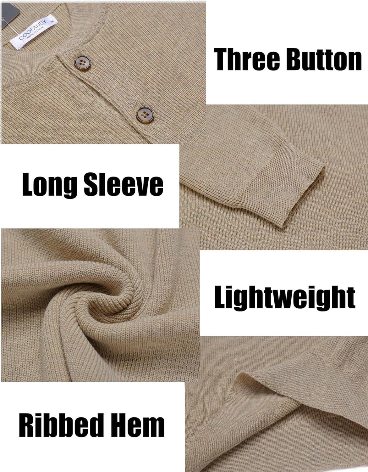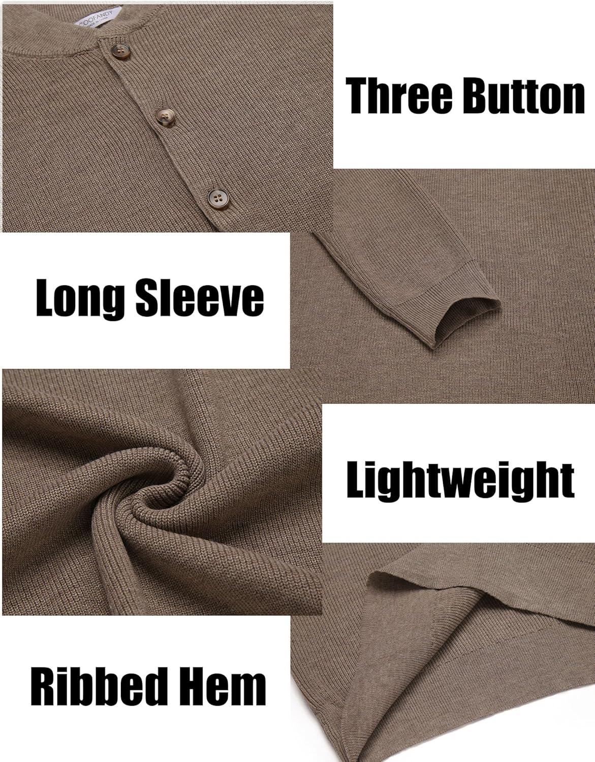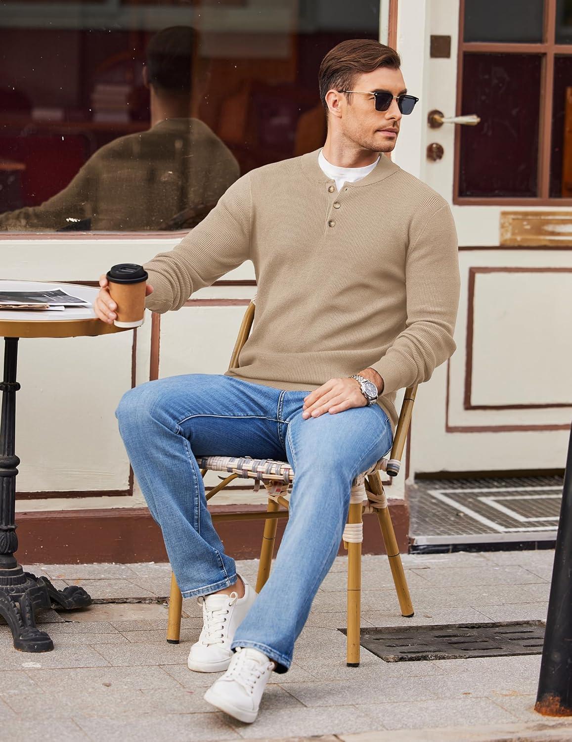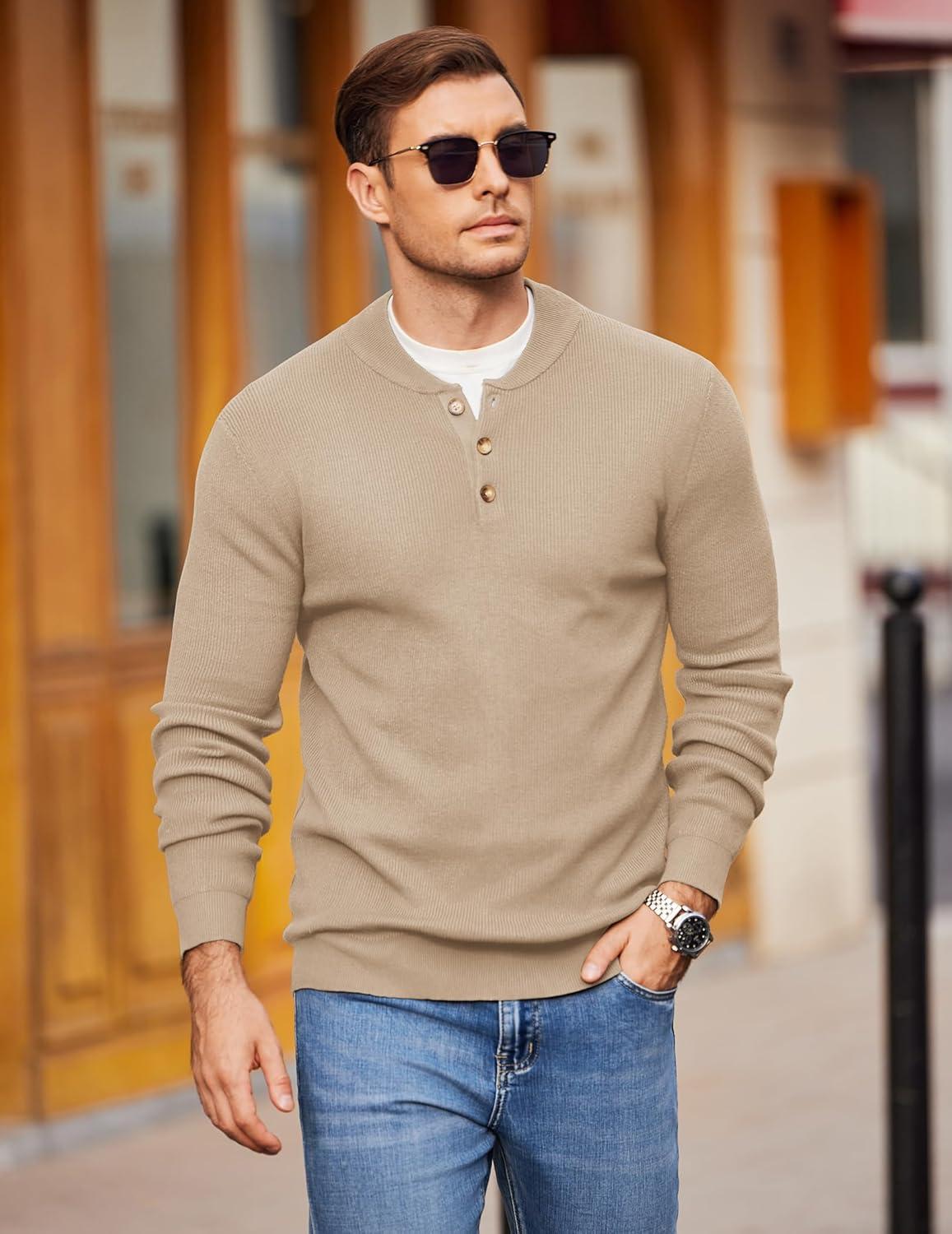 COOFANDY Men Henley Knit Sweater Dress Long Sleeve Button Pullover Sweater Casual Sweater Lightweight Slim Fit Tops(Khaki)