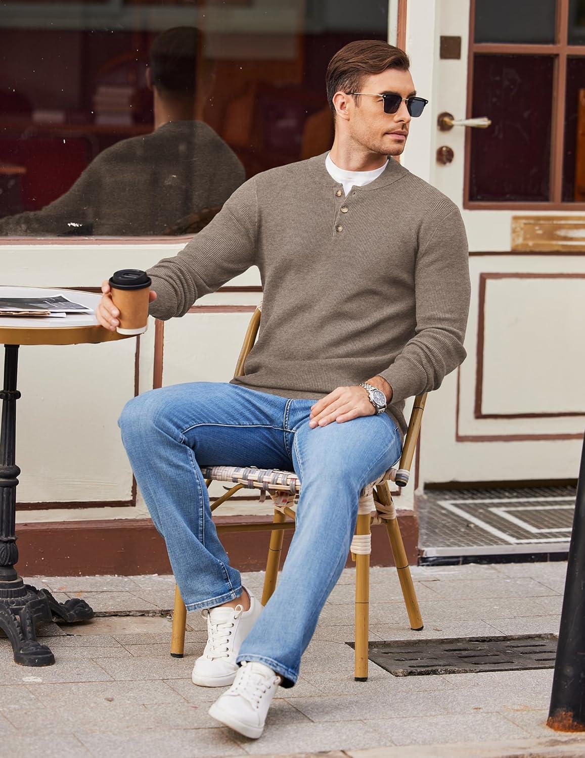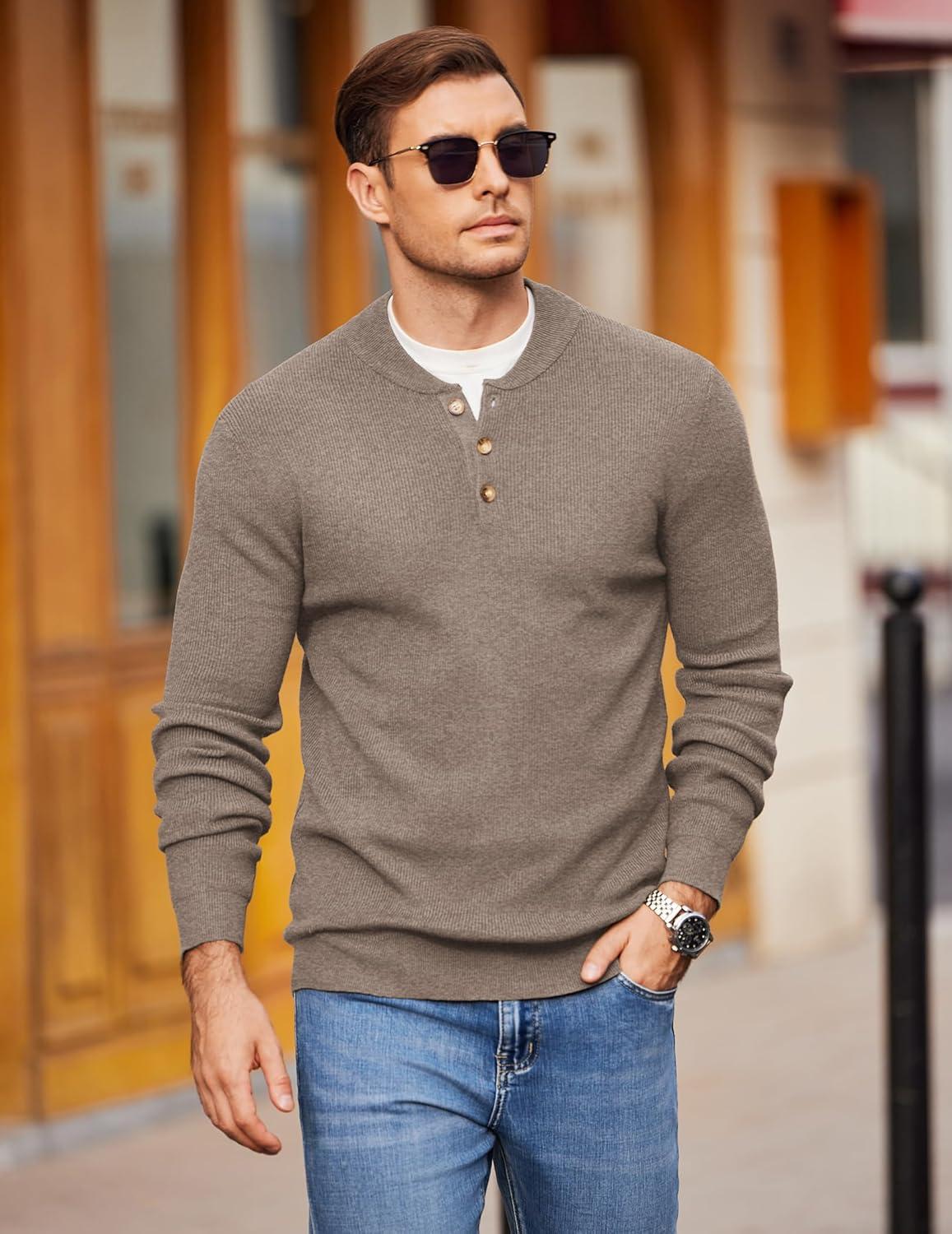 COOFANDY Men Henley Knit Sweater Dress Long Sleeve Button Pullover Sweater Casual Sweater Lightweight Slim Fit Tops(Brown and Grey)