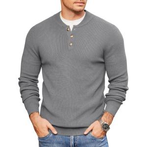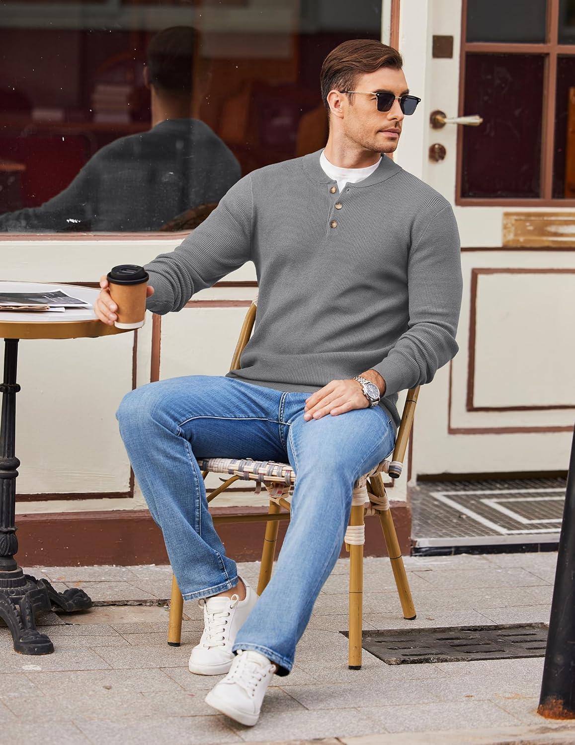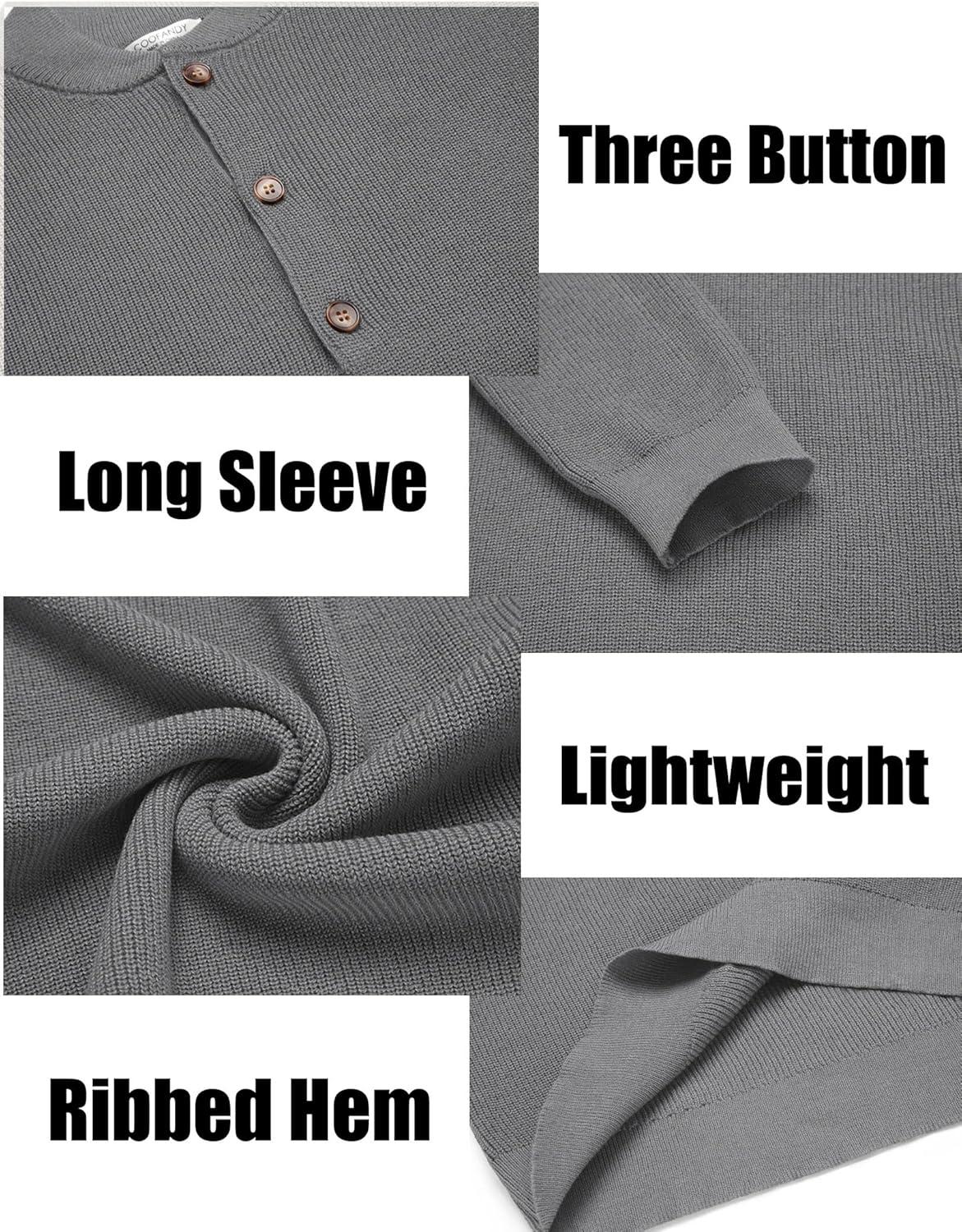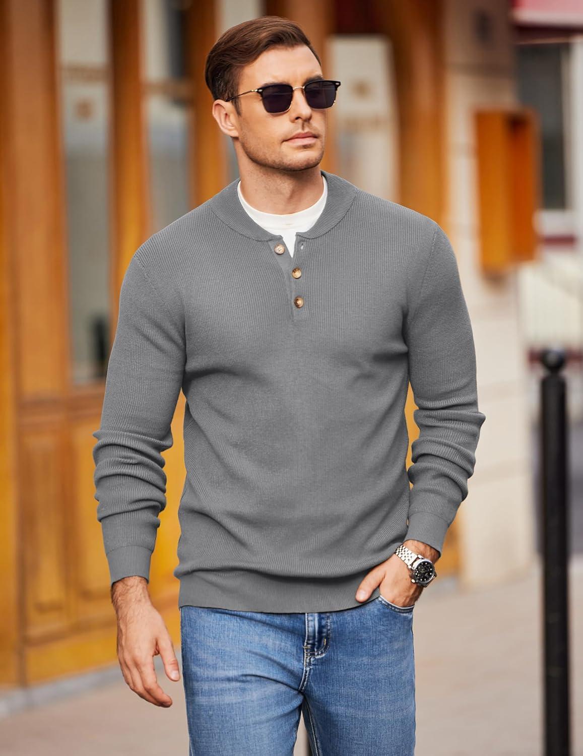 COOFANDY Men Henley Knit Sweater Dress Long Sleeve Button Pullover Sweater Casual Sweater Lightweight Slim Fit Tops(Dark Grey)