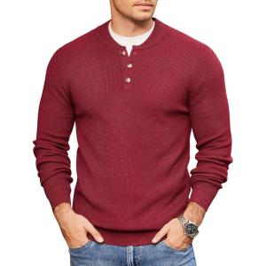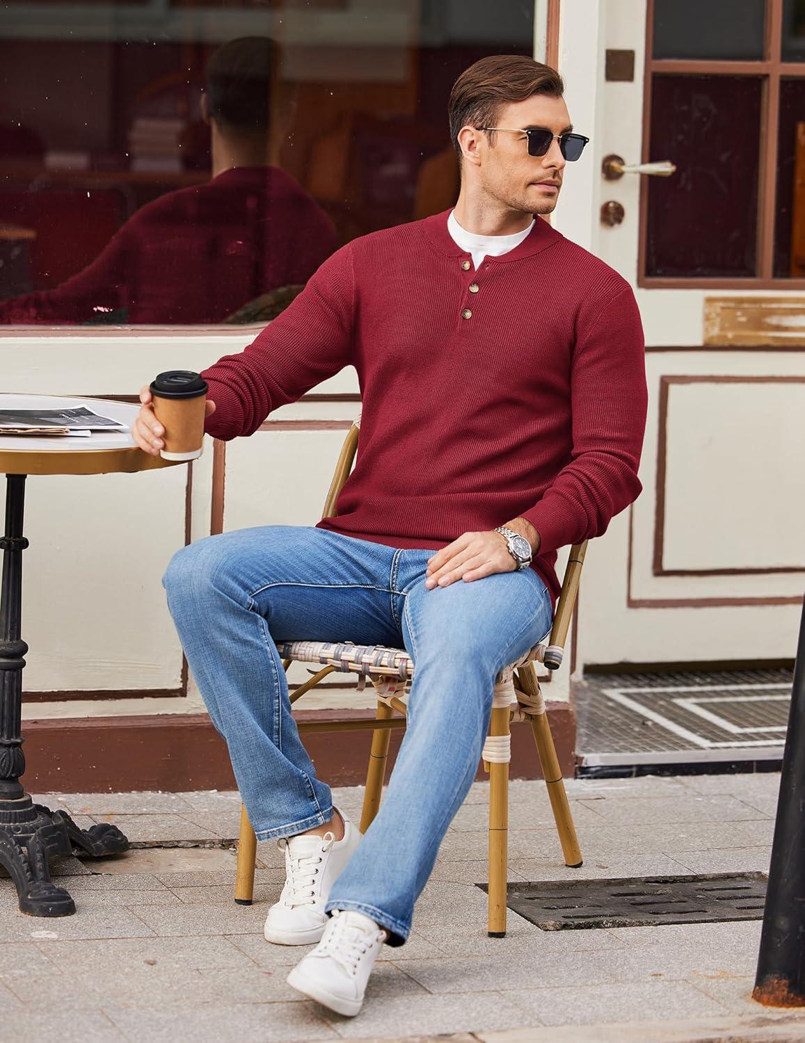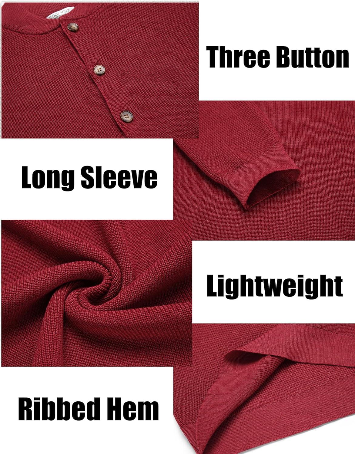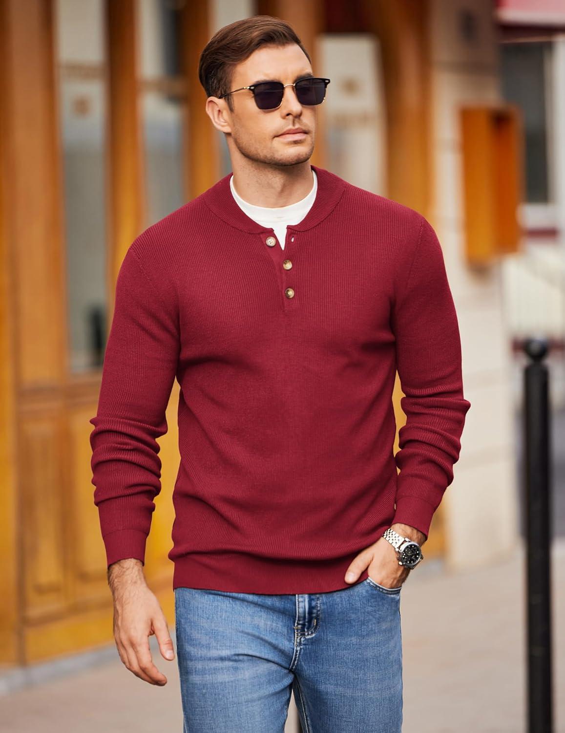 COOFANDY Men Henley Knit Sweater Dress Long Sleeve Button Pullover Sweater Casual Sweater Lightweight Slim Fit Tops(Deep Red)