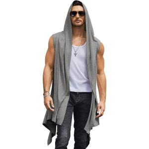 COOFANDY Men’s Long Hooded Cardigan Sleeveless Ruffle Shawl Collar Lightweight Open Front Drape Kimono Vest(Middle Grey)