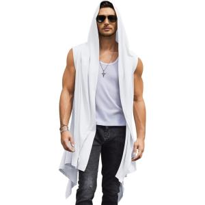 COOFANDY Men’s Long Hooded Cardigan Sleeveless Ruffle Shawl Collar Lightweight Open Front Drape Kimono Vest(White)