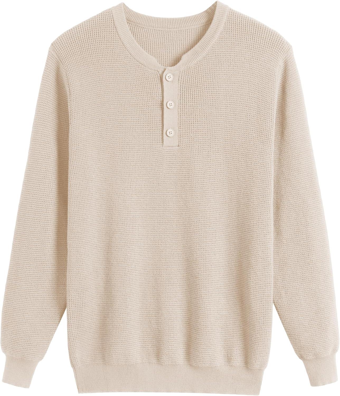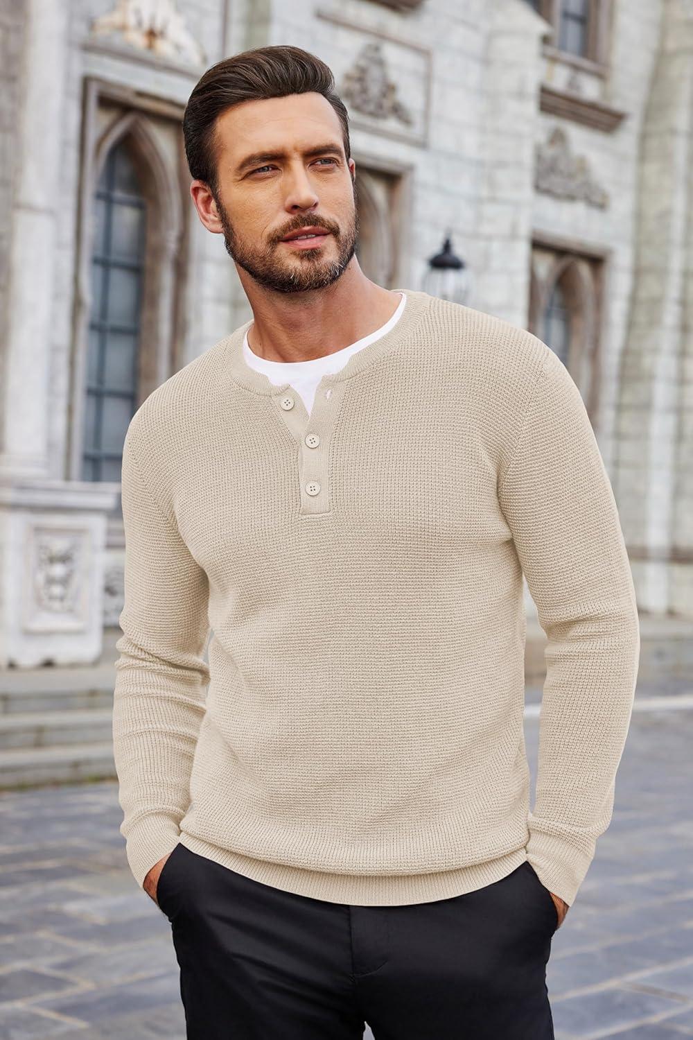 COOFANDY Men’s Waffle Henley Shirts Crewneck Lightweight Sweater Long Sleeve Causal Knitted Pullover T Shirt(Beige)