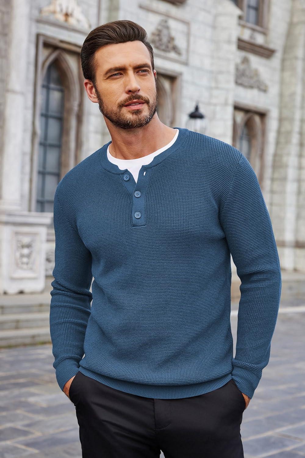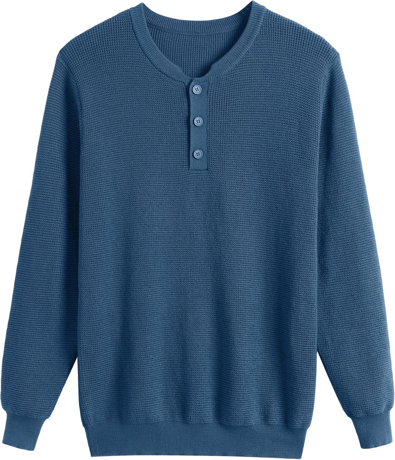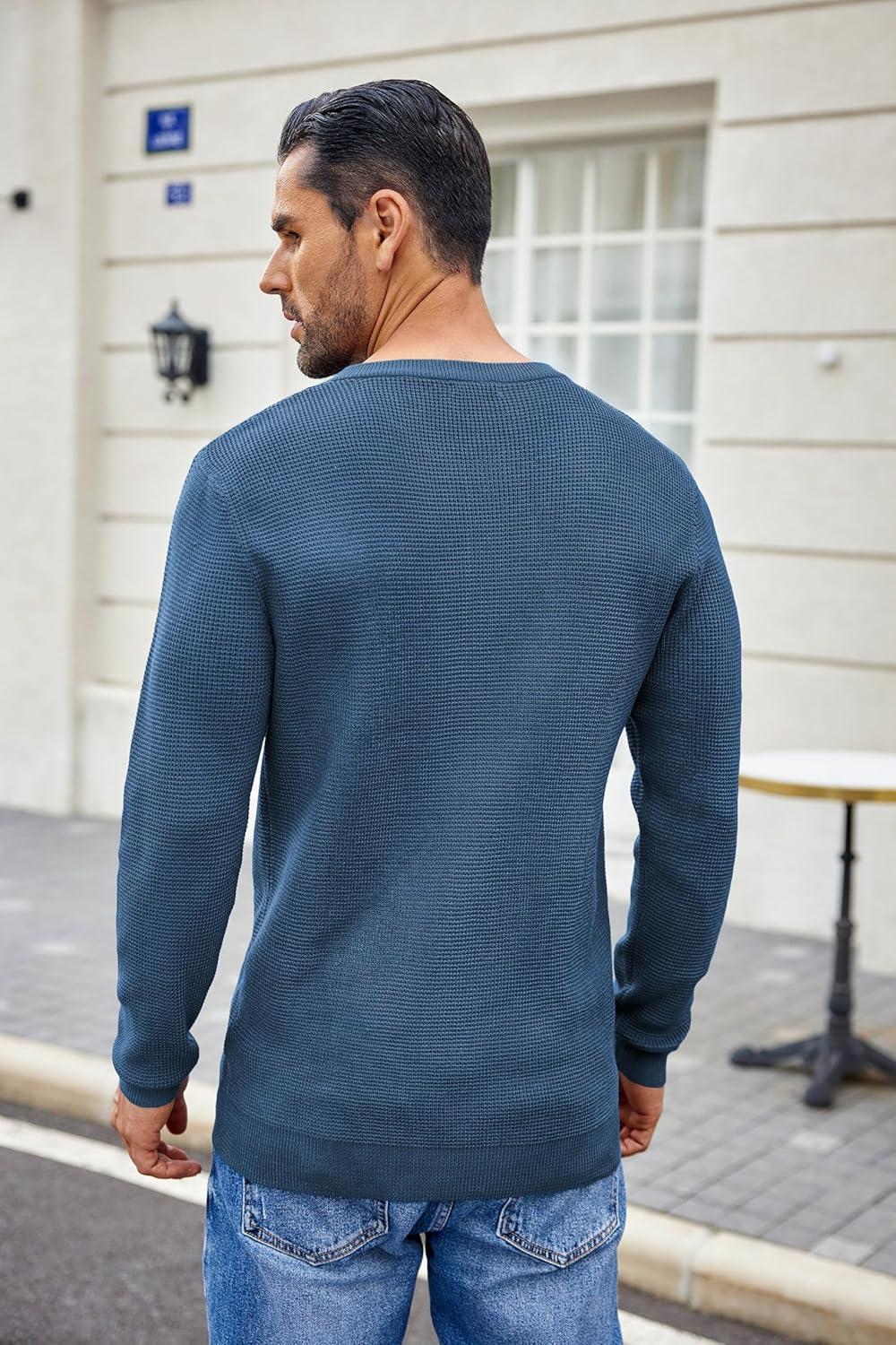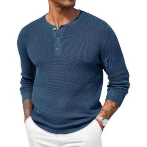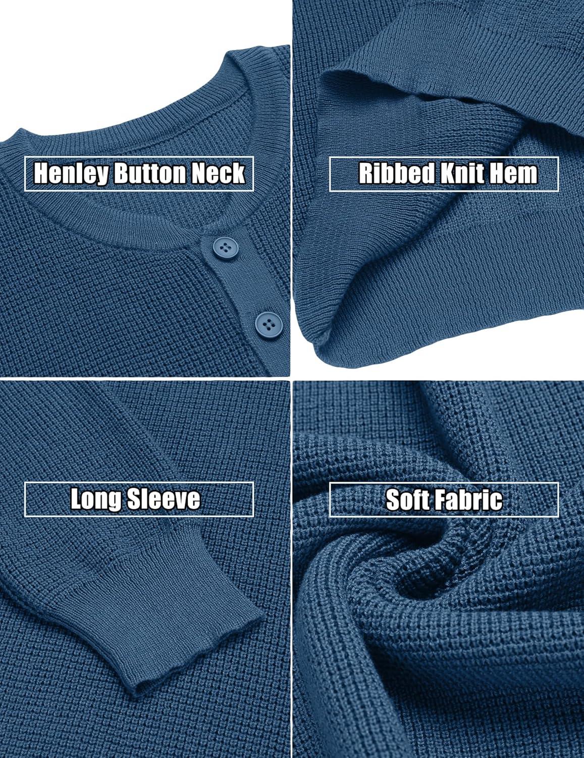 COOFANDY Men’s Waffle Henley Shirts Crewneck Lightweight Sweater Long Sleeve Causal Knitted Pullover T Shirt(Dark Blue)