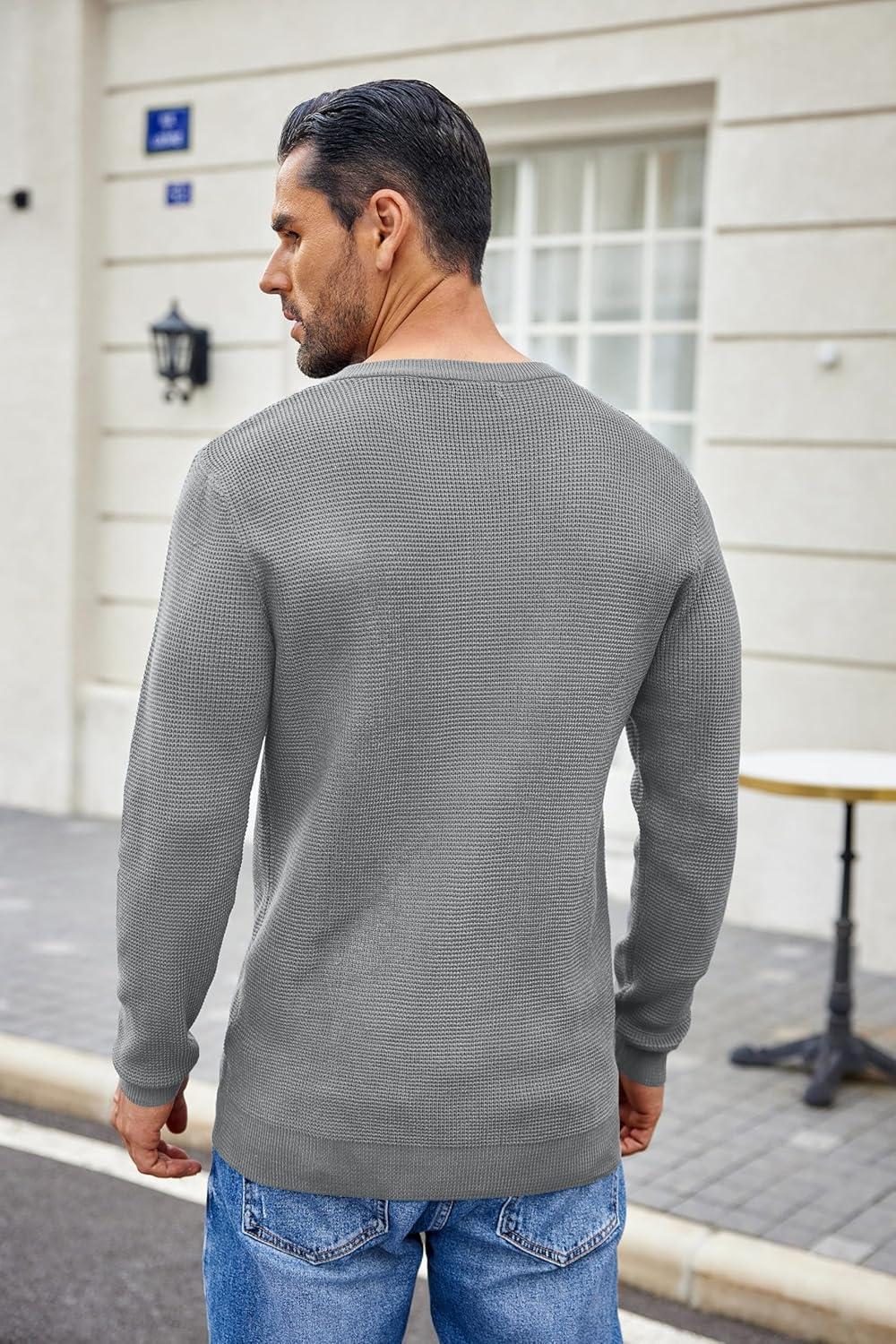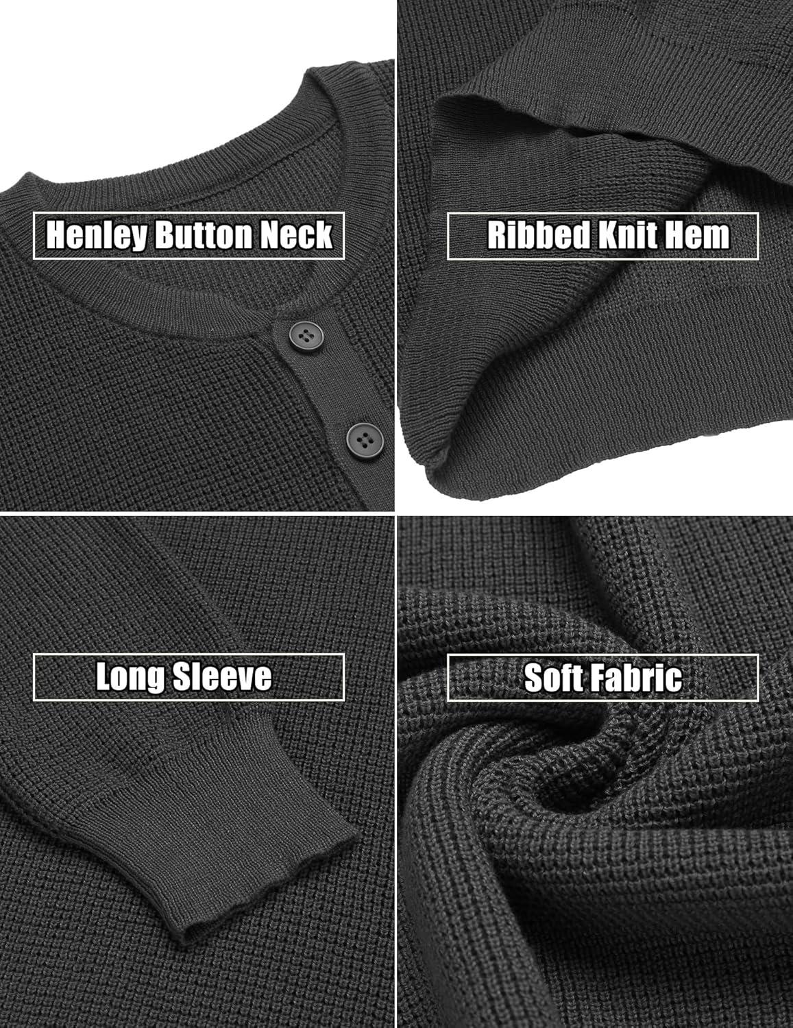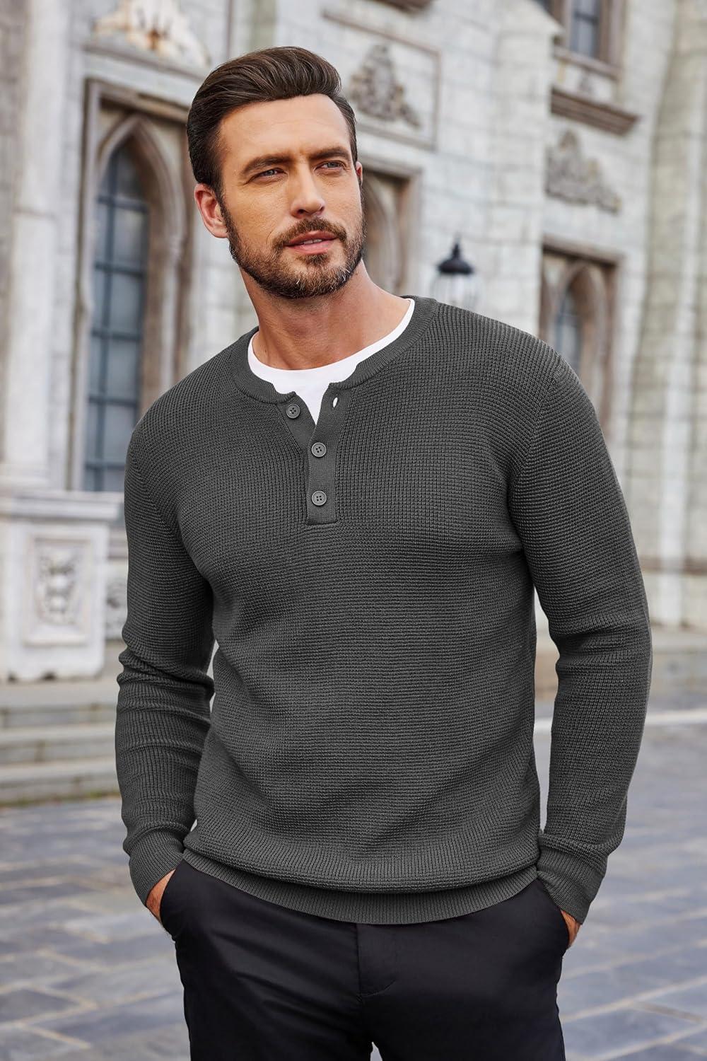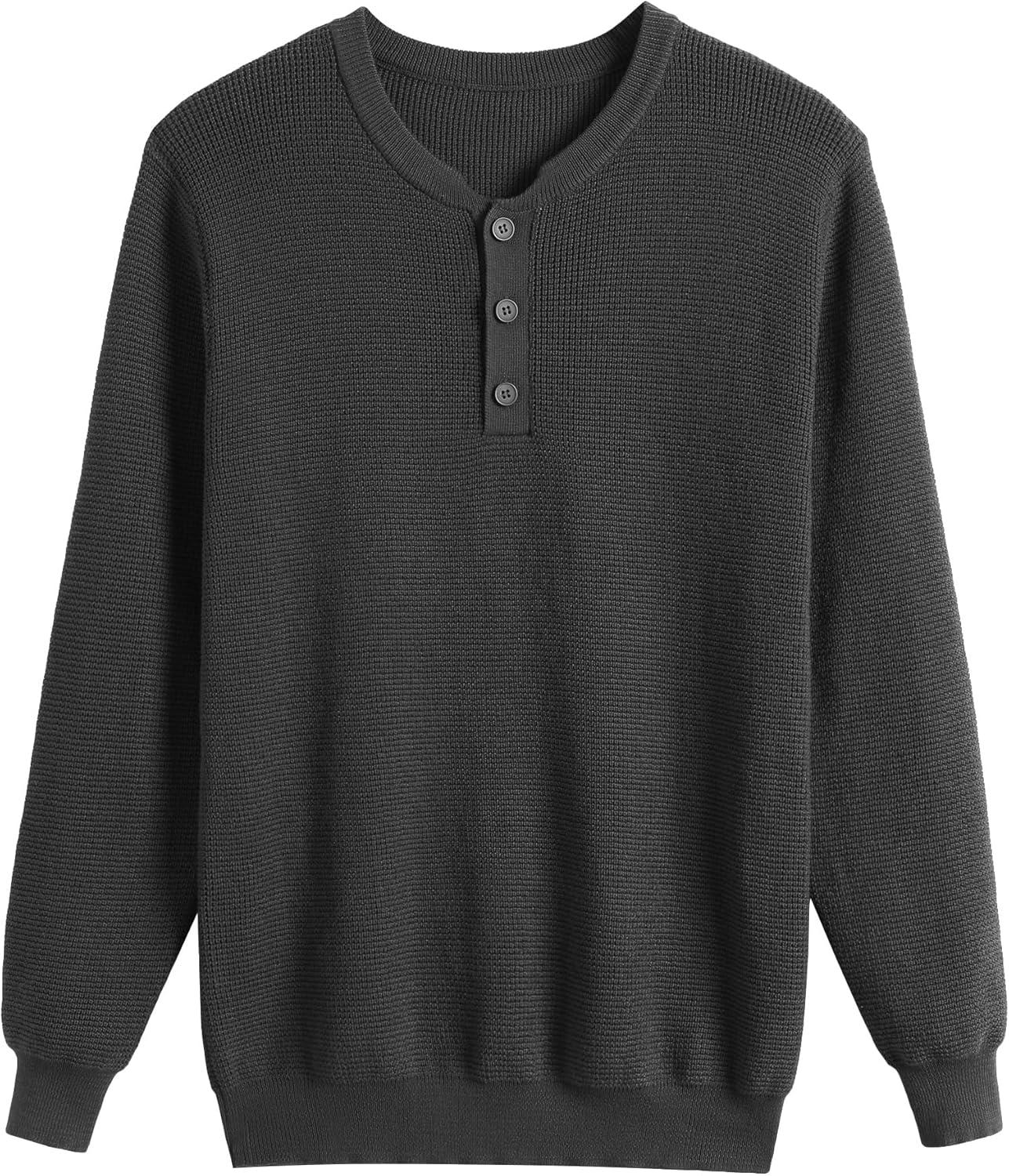 COOFANDY Men’s Waffle Henley Shirts Crewneck Lightweight Sweater Long Sleeve Causal Knitted Pullover T Shirt(Dark Grey)