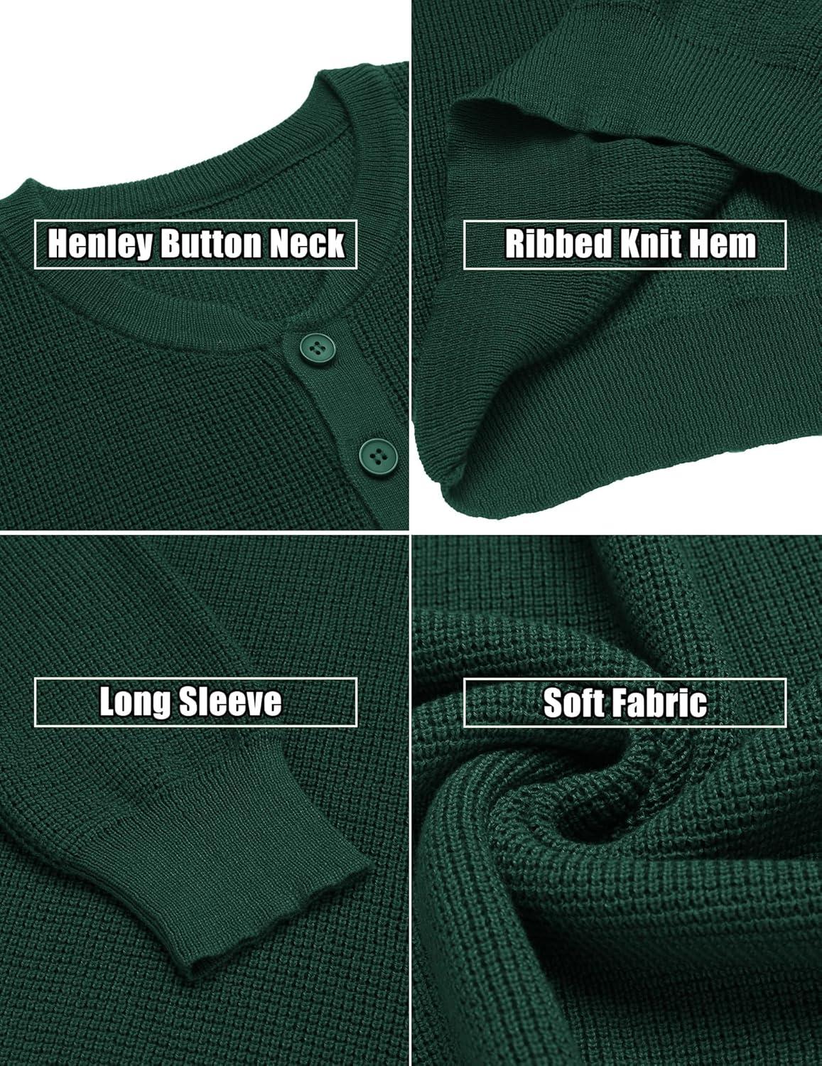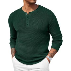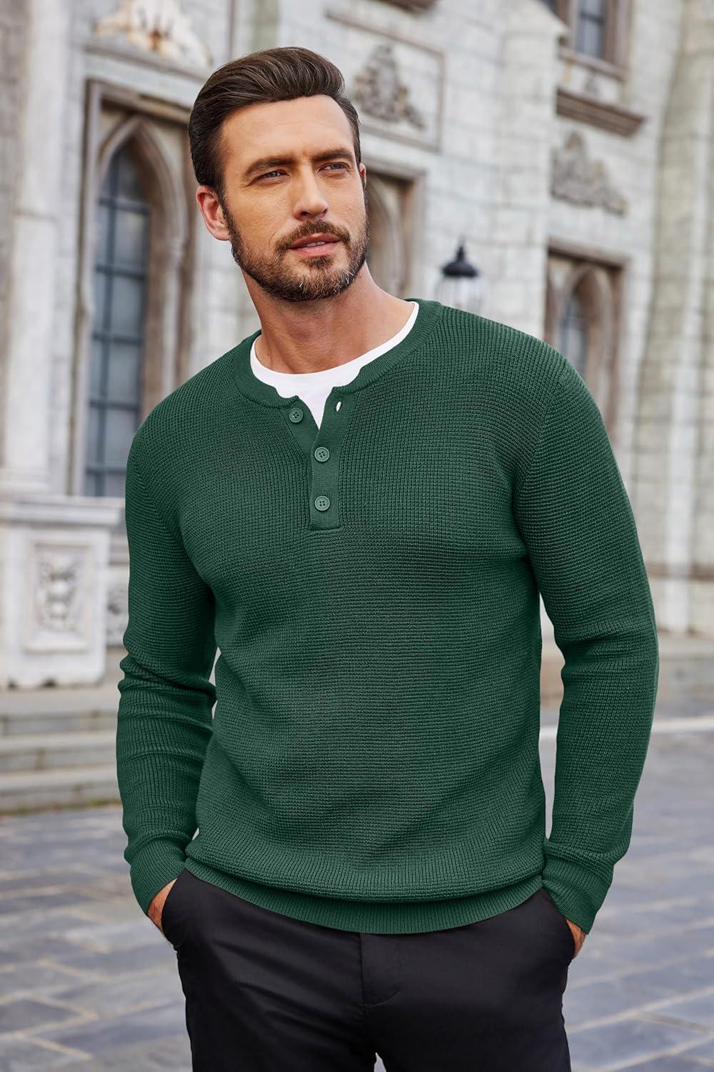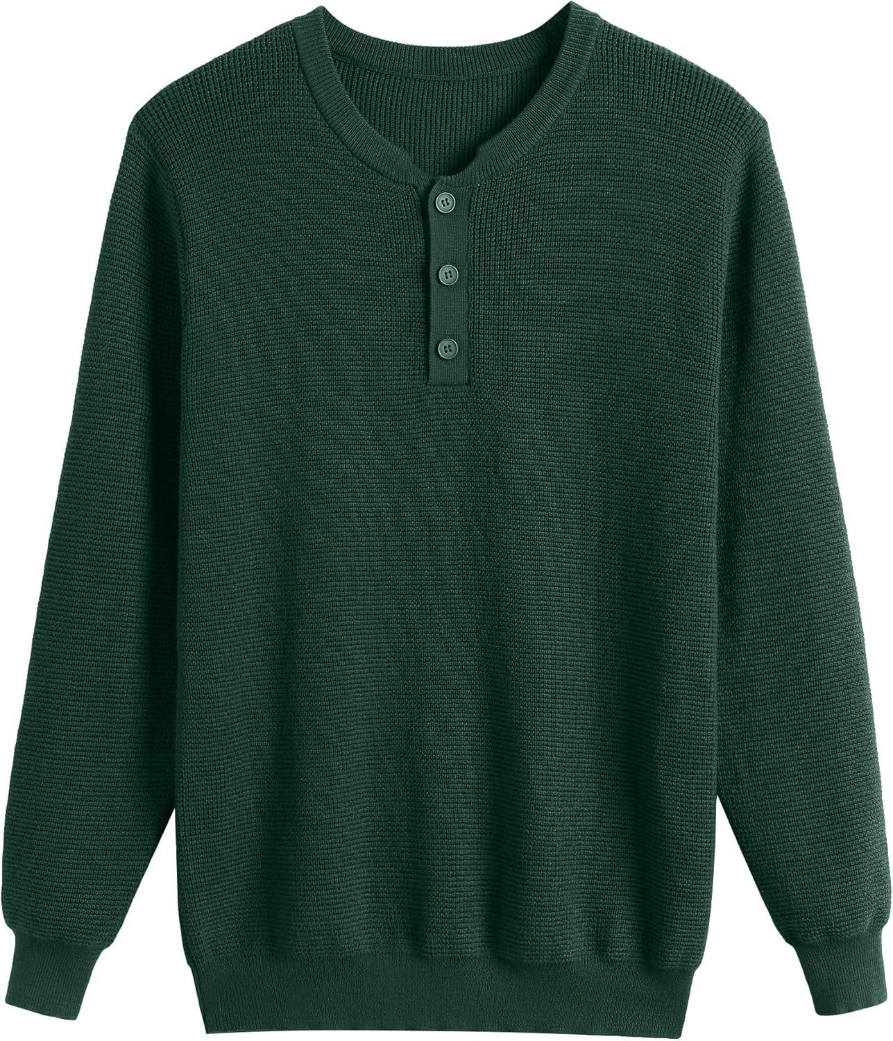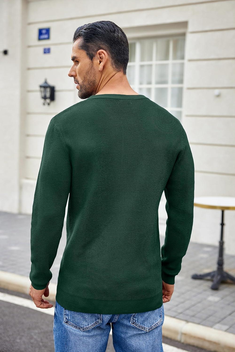 COOFANDY Men’s Waffle Henley Shirts Crewneck Lightweight Sweater Long Sleeve Causal Knitted Pullover T Shirt(Green)