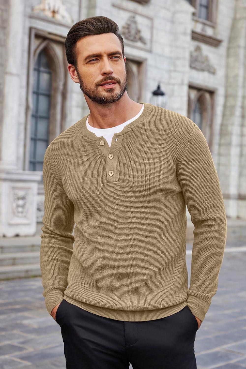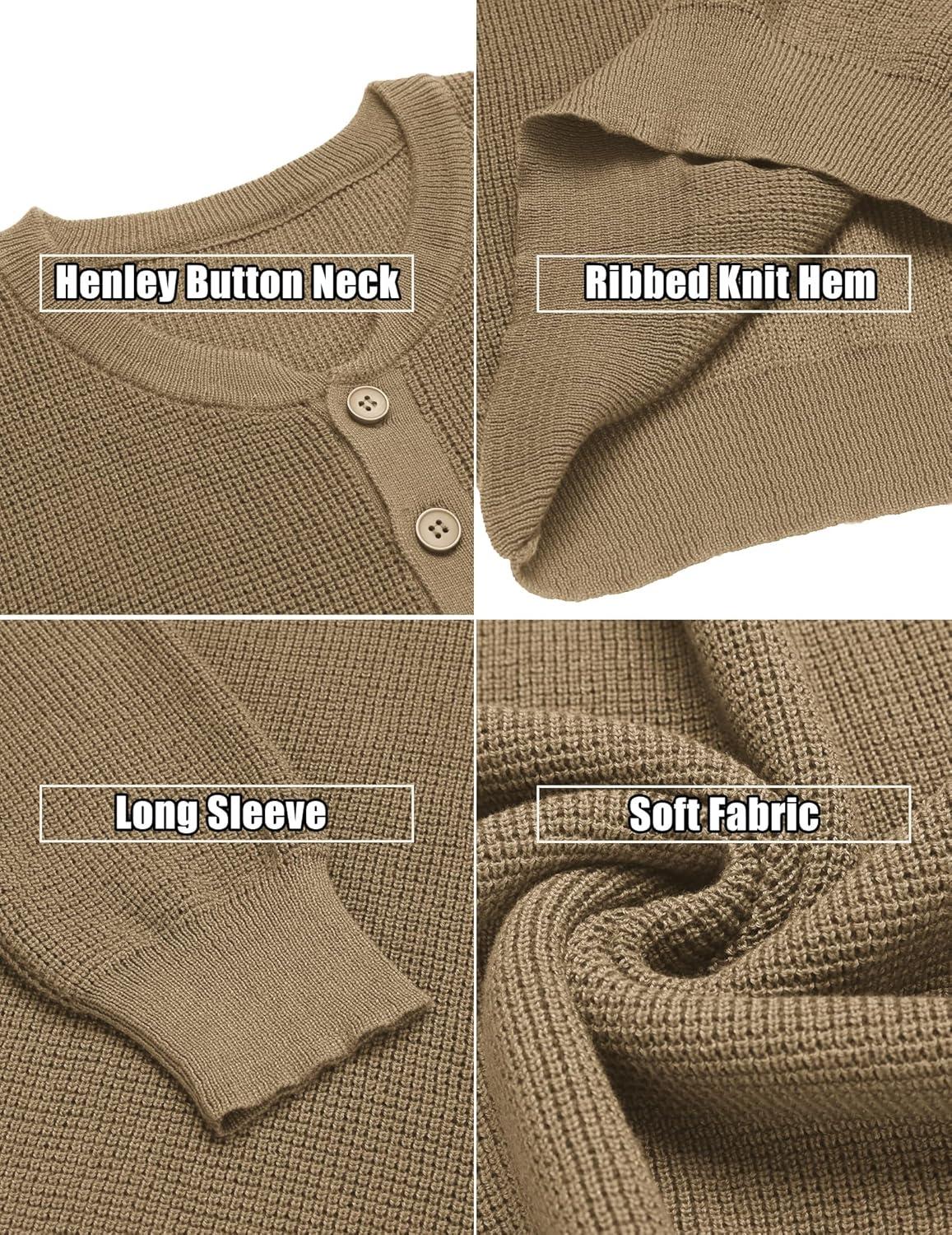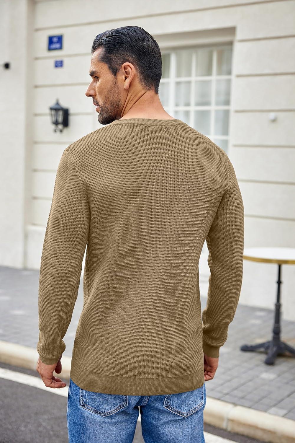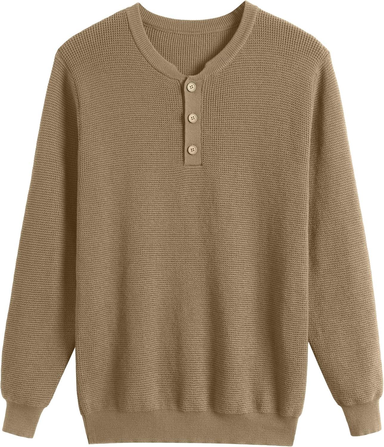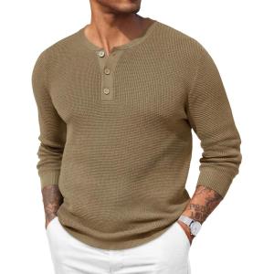 COOFANDY Men’s Waffle Henley Shirts Crewneck Lightweight Sweater Long Sleeve Causal Knitted Pullover T Shirt(Khaki)