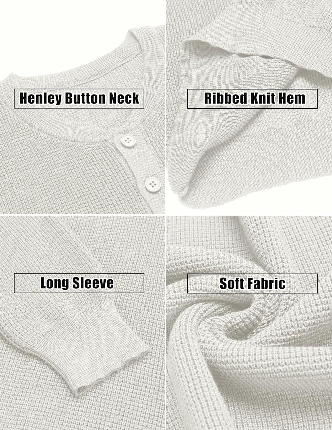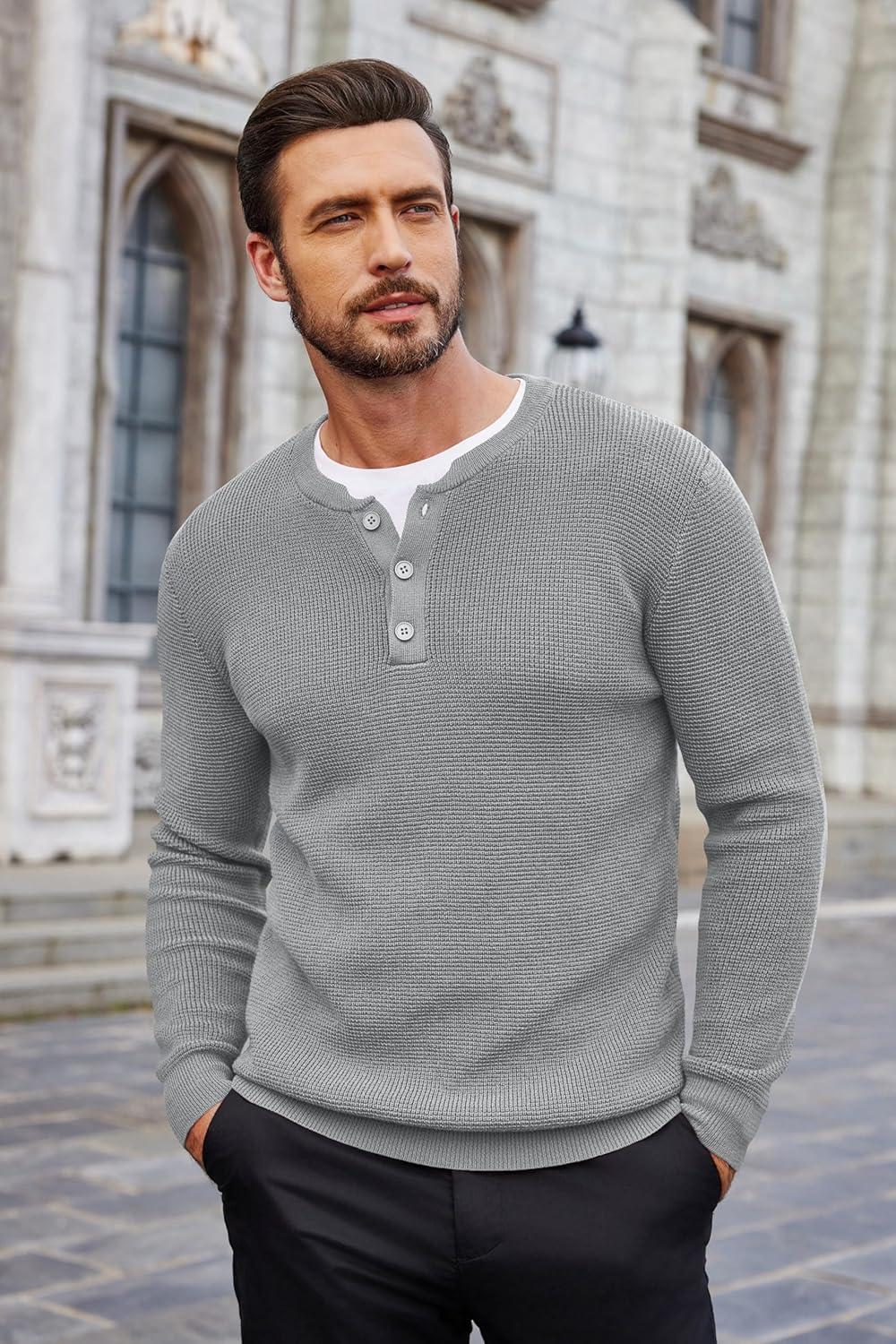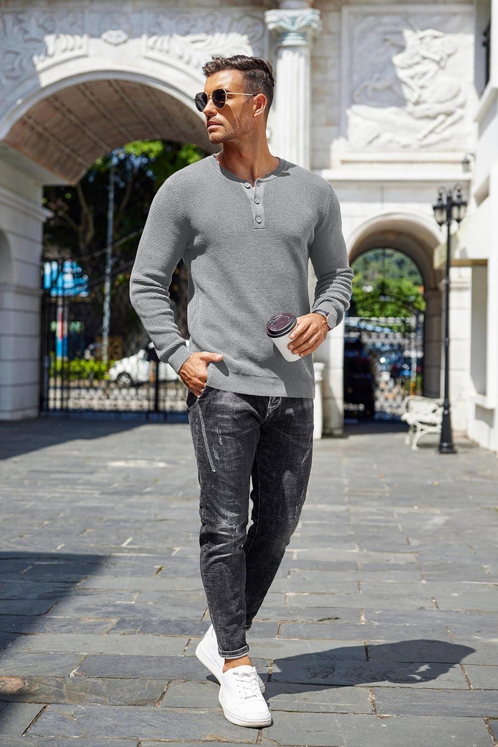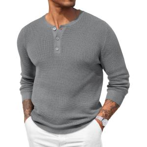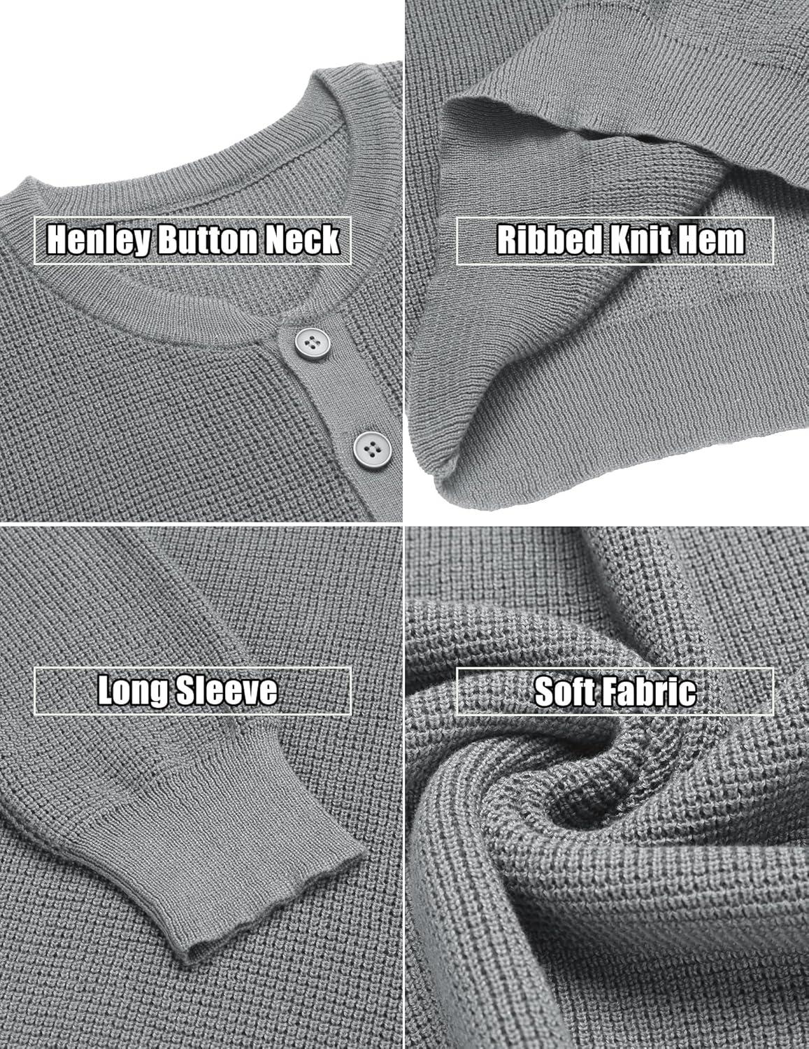 COOFANDY Men’s Waffle Henley Shirts Crewneck Lightweight Sweater Long Sleeve Causal Knitted Pullover T Shirt(Light Grey)