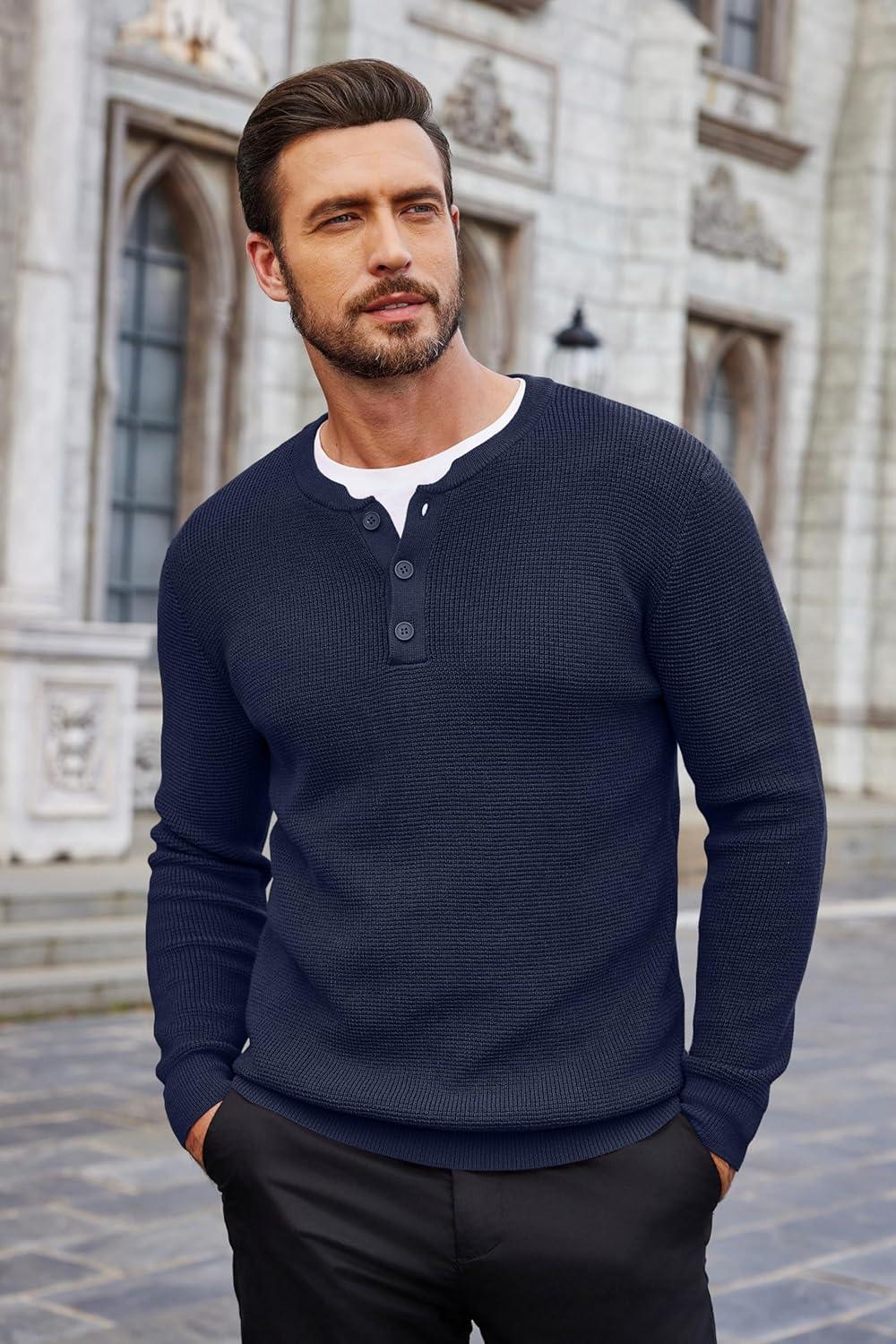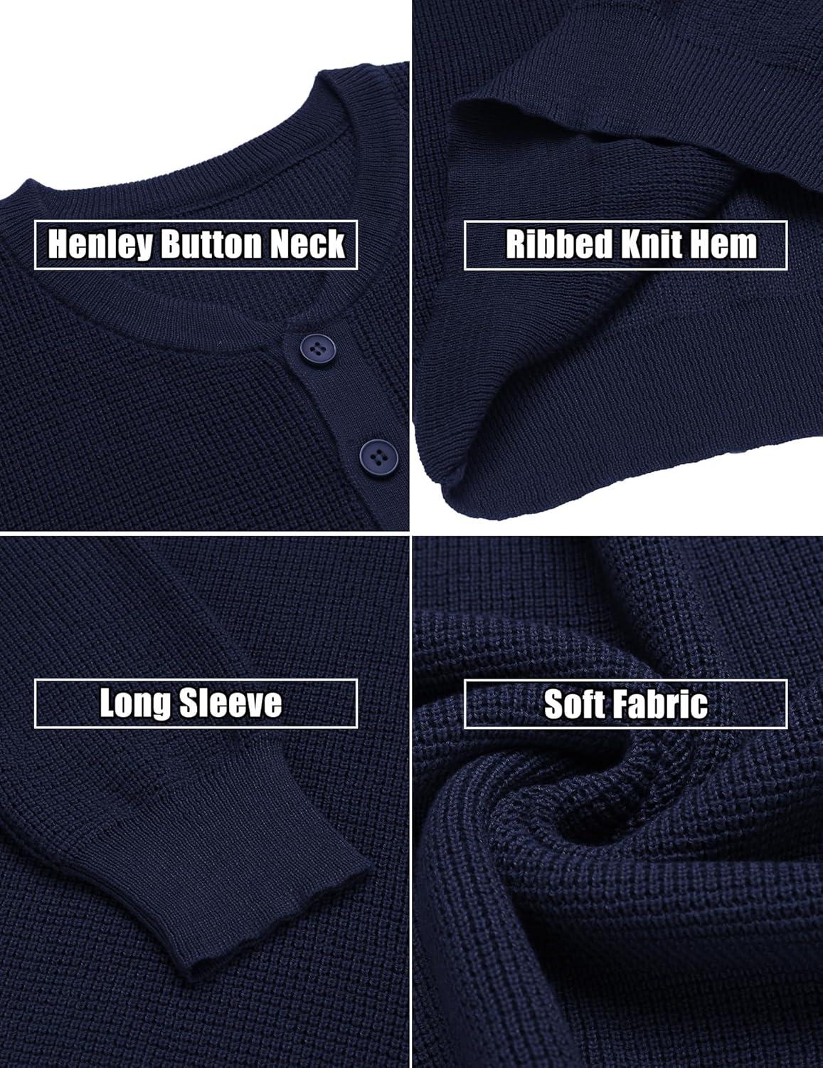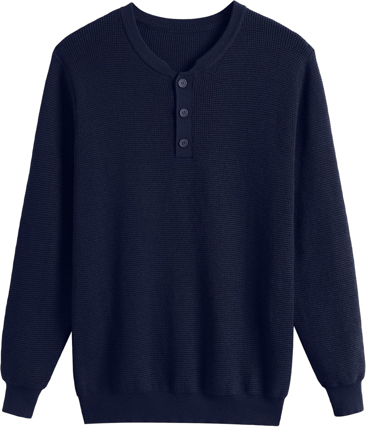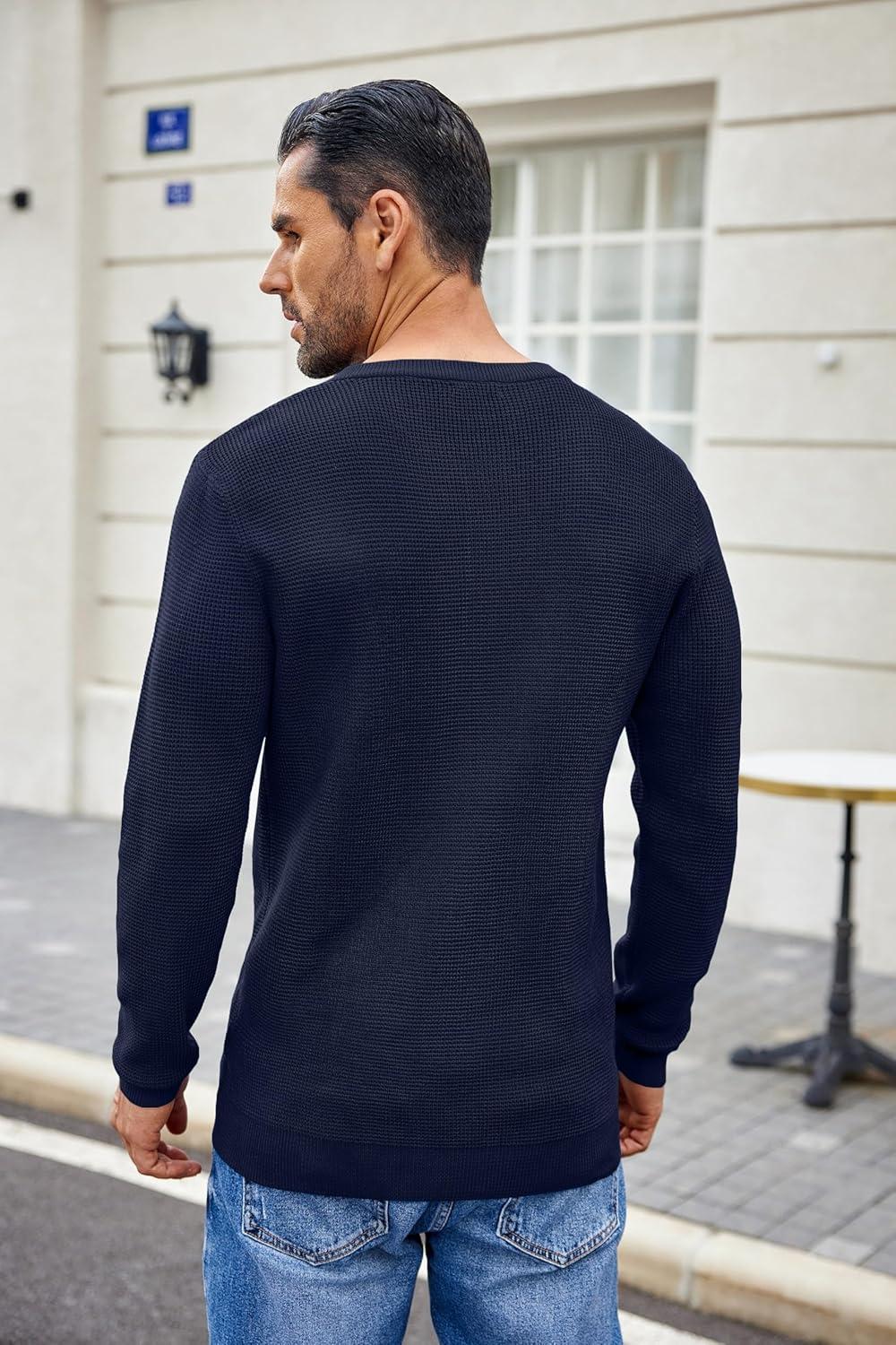 COOFANDY Men’s Waffle Henley Shirts Crewneck Lightweight Sweater Long Sleeve Causal Knitted Pullover T Shirt(Navy)