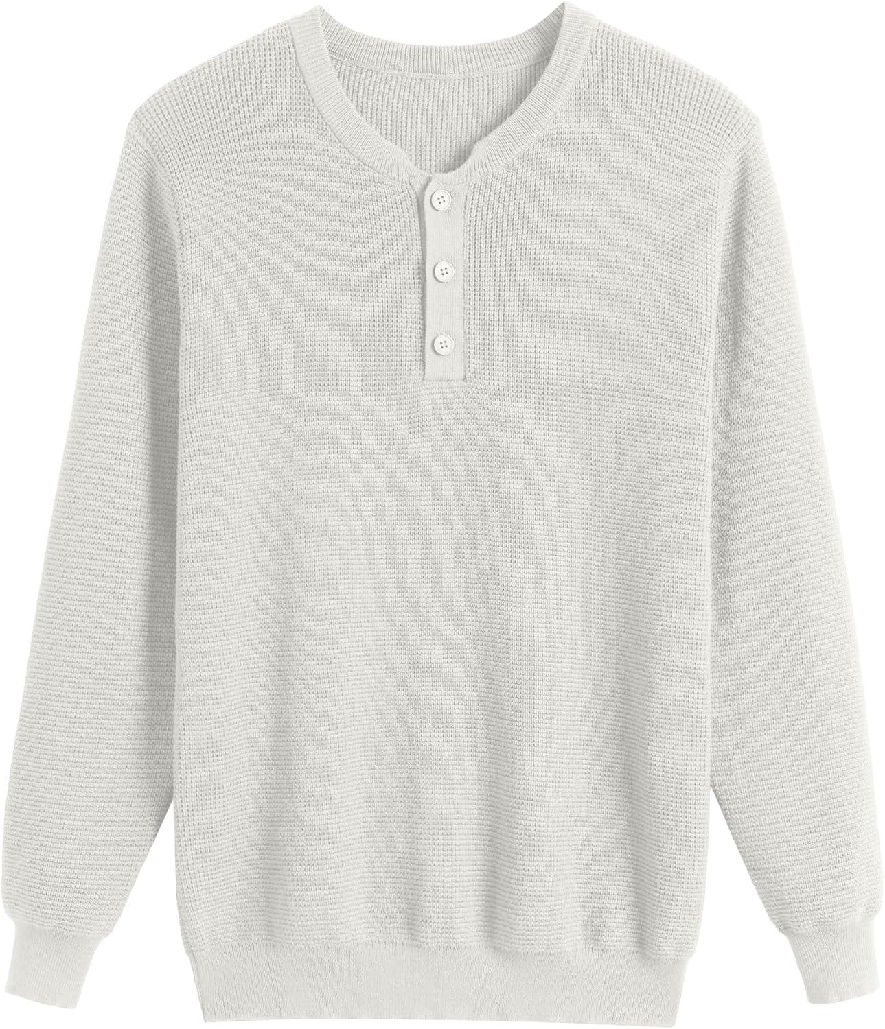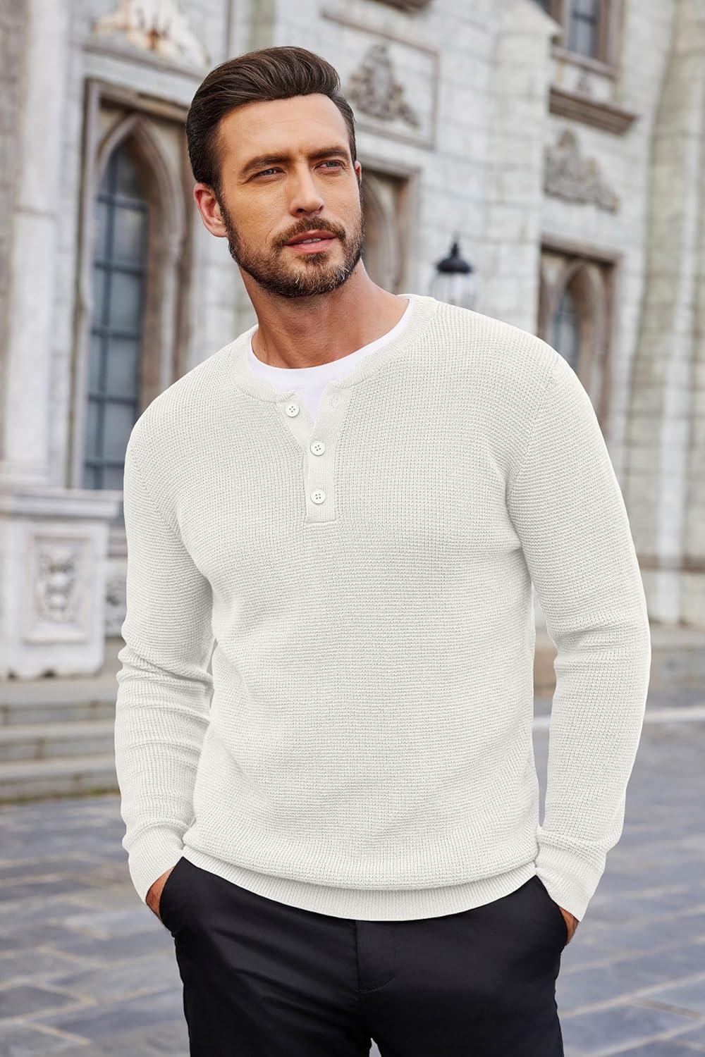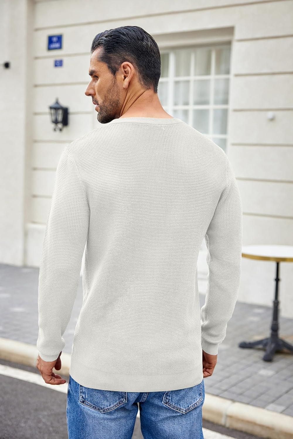 COOFANDY Men’s Waffle Henley Shirts Crewneck Lightweight Sweater Long Sleeve Causal Knitted Pullover T Shirt(White)