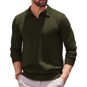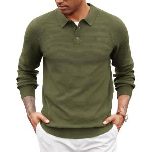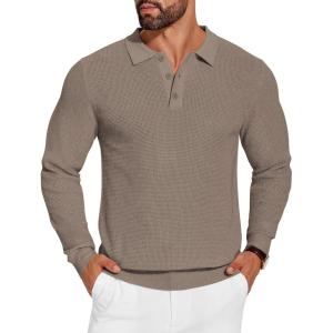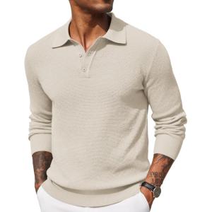 • COOFANDY Mens Knit Polo Shirts Casual Long Sleeve Classic Polo Shirts Button Down Golf Shirts(Khaki)