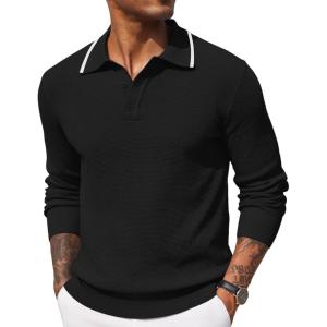 • COOFANDY Mens Knit Polo Shirts Casual Long Sleeve Classic Polo Shirts Button Down Golf Shirts(Herringbone Grey)