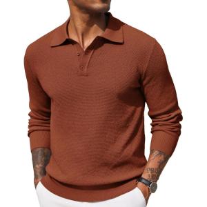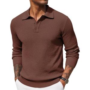 • COOFANDY Mens Knit Polo Shirts Casual Long Sleeve Classic Polo Shirts Button Down Golf Shirts(Herringbone Brown)
