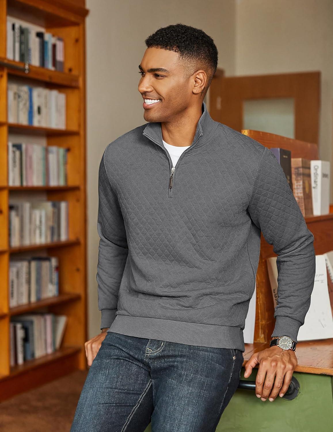 COOFANDY Men Quarter Zip Pullover Long Sleeve Quilted Sweatshirt Waffle Casual Collared Sweatshirts Mock Neck Winter Polo(Dark Gray)