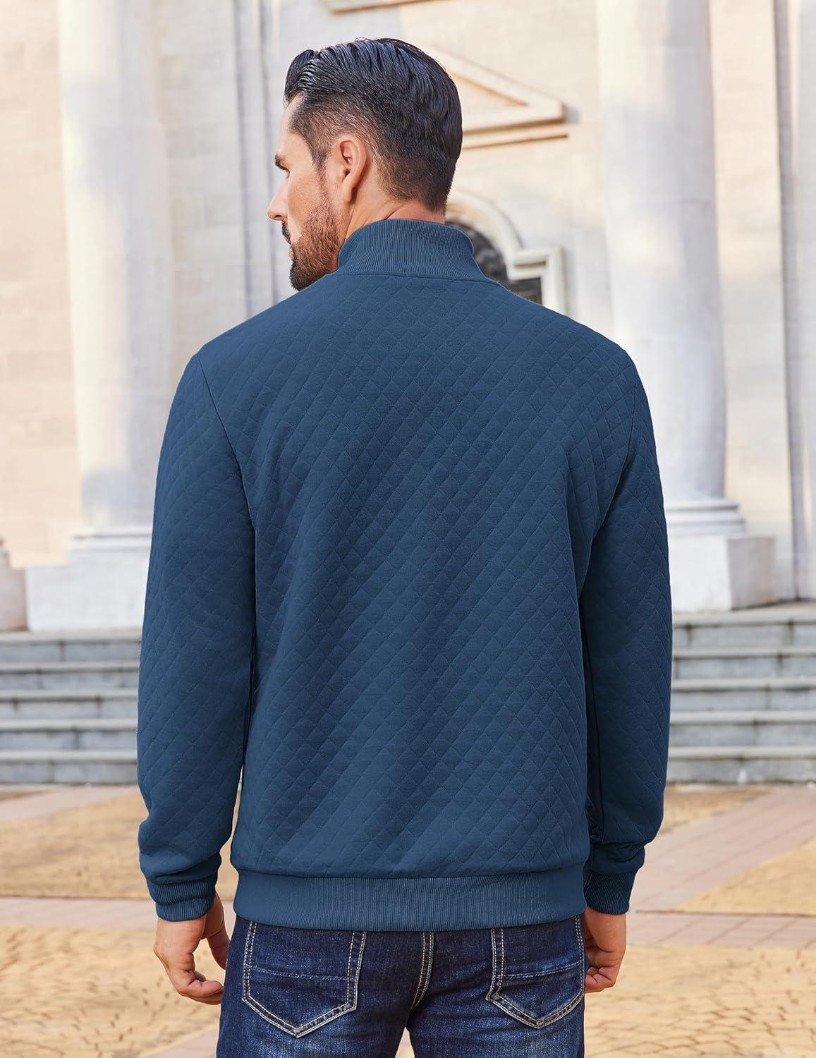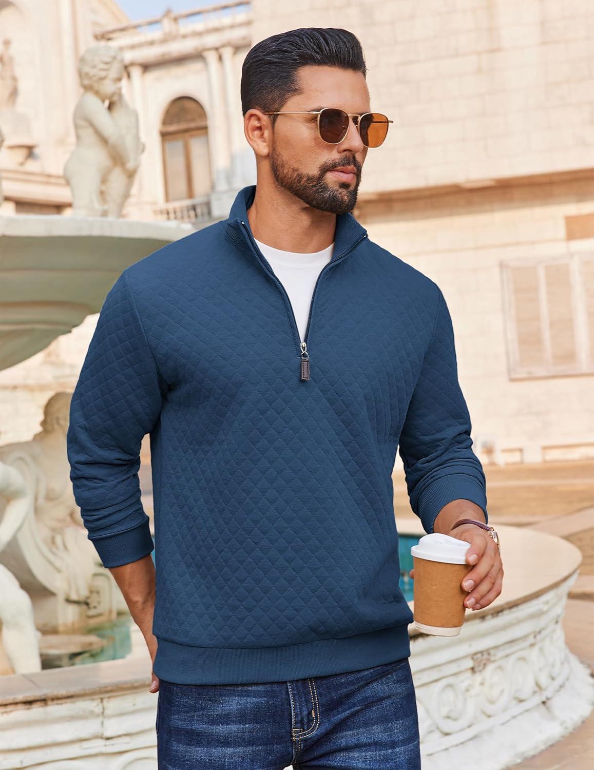 COOFANDY Men Quarter Zip Pullover Long Sleeve Quilted Sweatshirt Waffle Casual Collared Sweatshirts Mock Neck Winter Polo(Deep Blue)