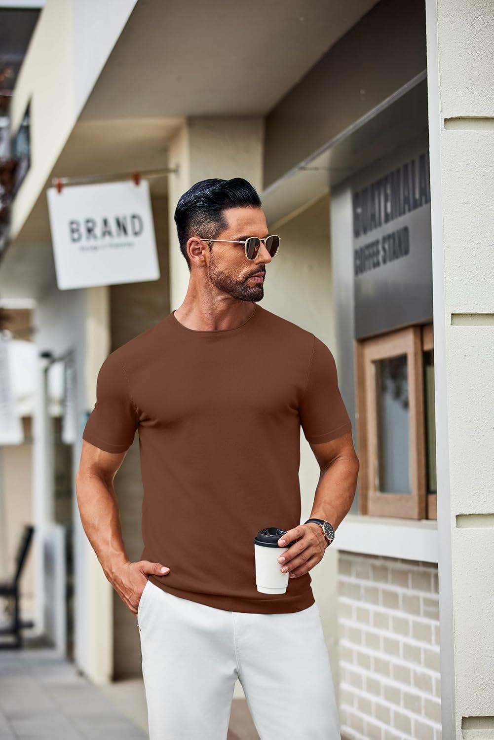 COOFANDY Mens Knit T-Shirts Casual Crewneck Short Sleeve Shirts Summer Tops Basic Pullover Tees(Brown)