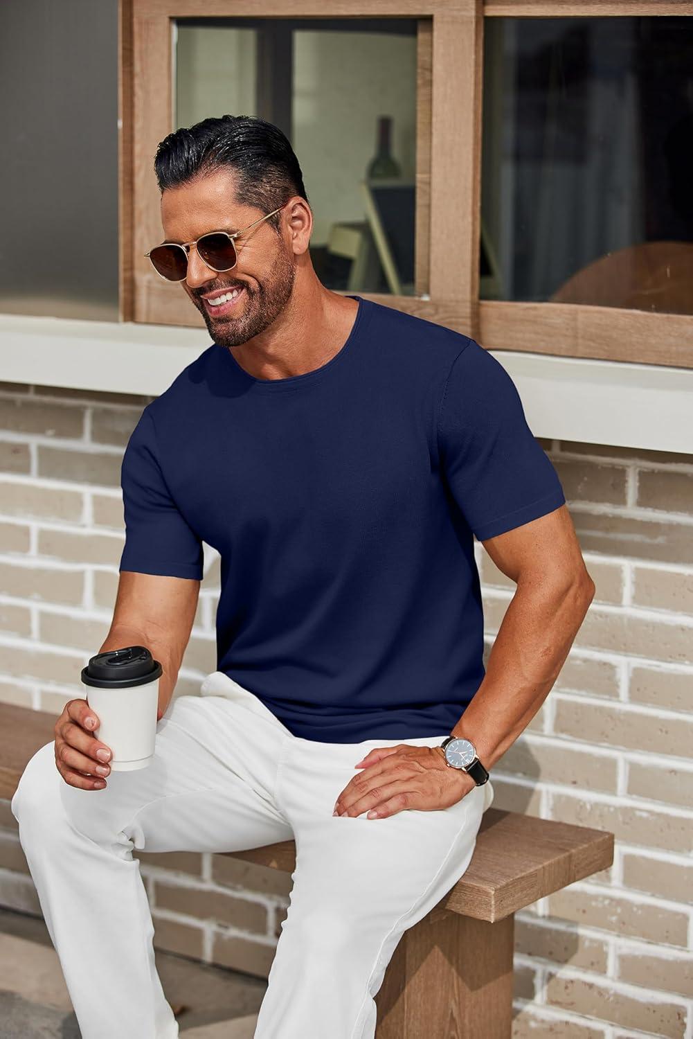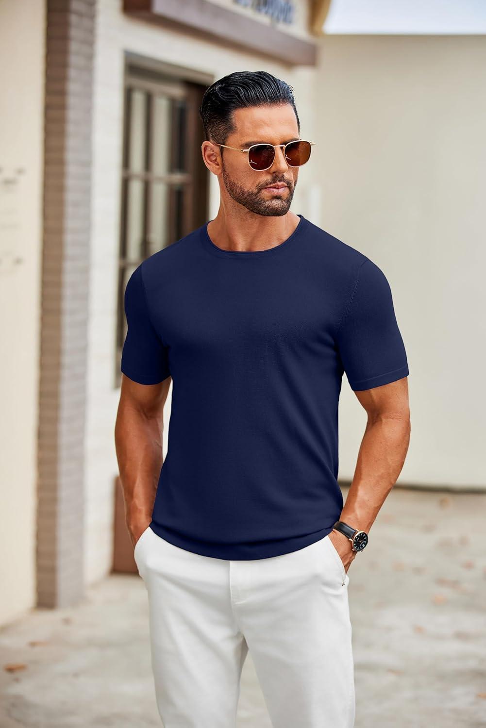 COOFANDY Mens Knit T-Shirts Casual Crewneck Short Sleeve Shirts Summer Tops Basic Pullover Tees(Navy Blue)