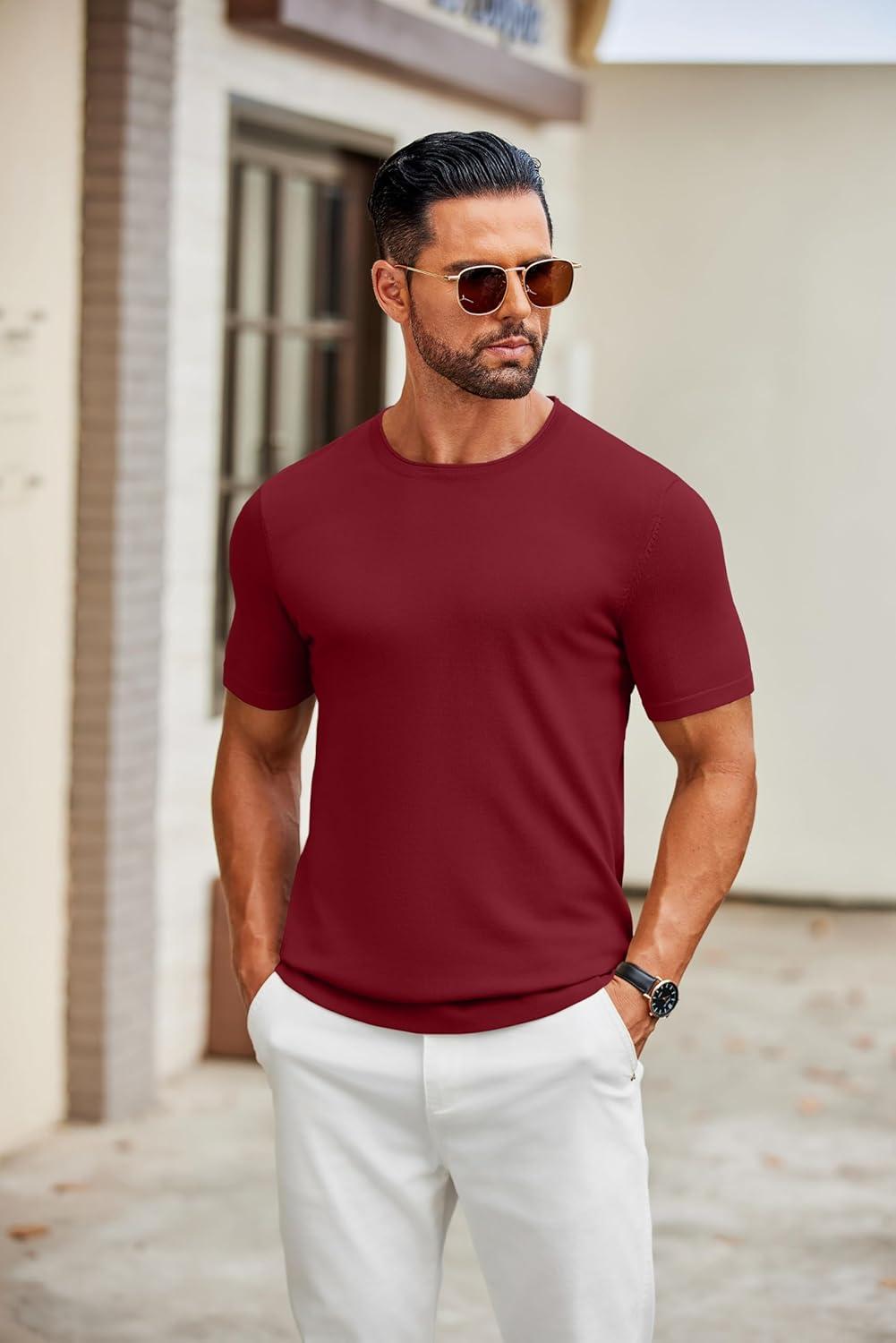 COOFANDY Mens Knit T-Shirts Casual Crewneck Short Sleeve Shirts Summer Tops Basic Pullover Tees(Wine Red)