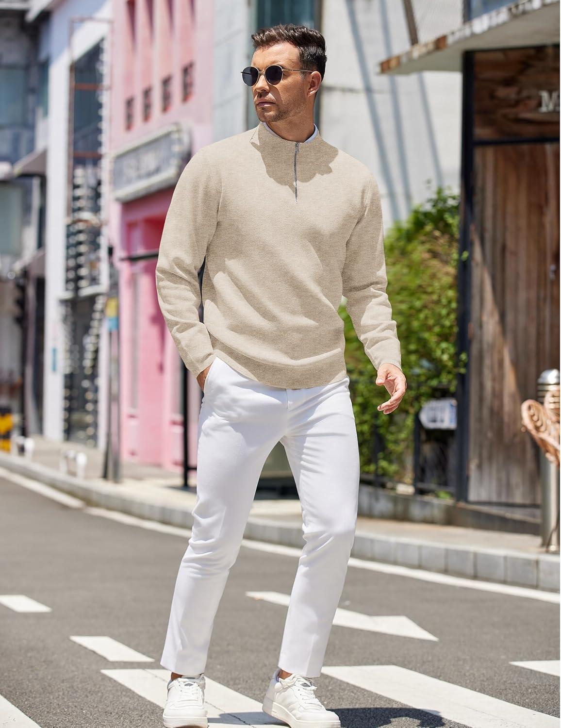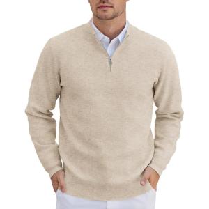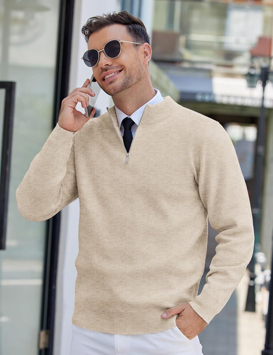 COOFANDY Mens Quarter Zip Pullover Slim Fit Lightweight Knit Pullover Sweaters Casual Polo Sweater(Khaki)