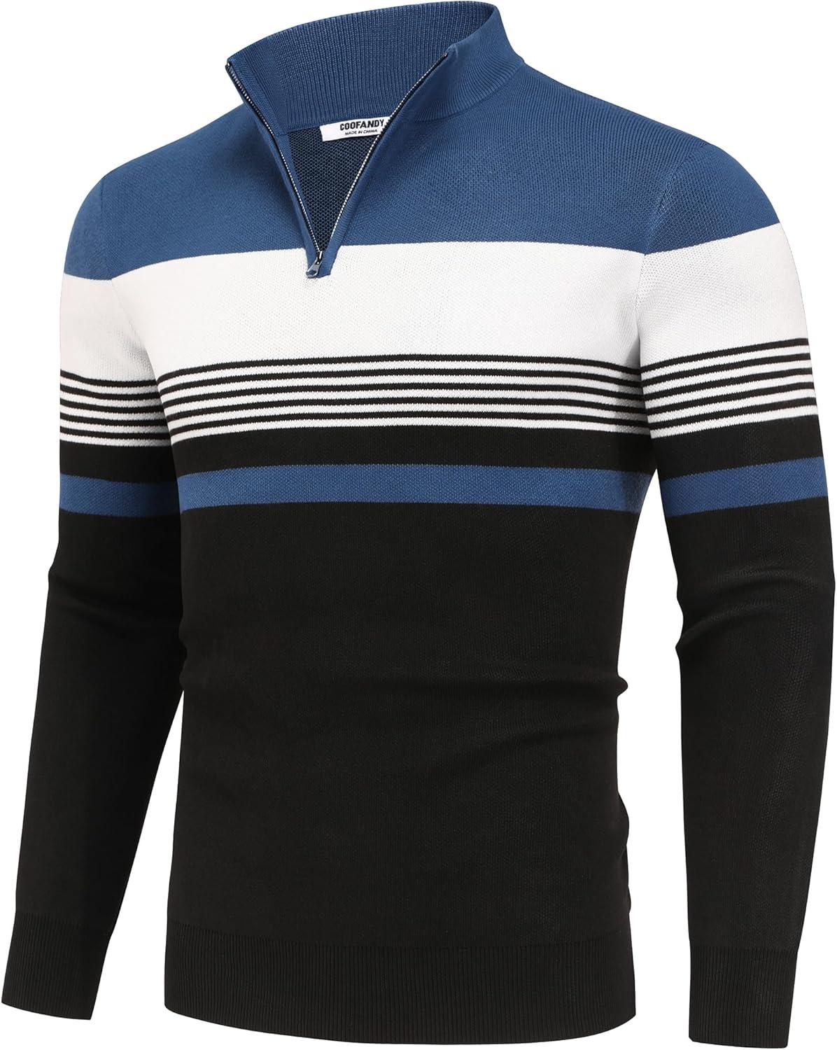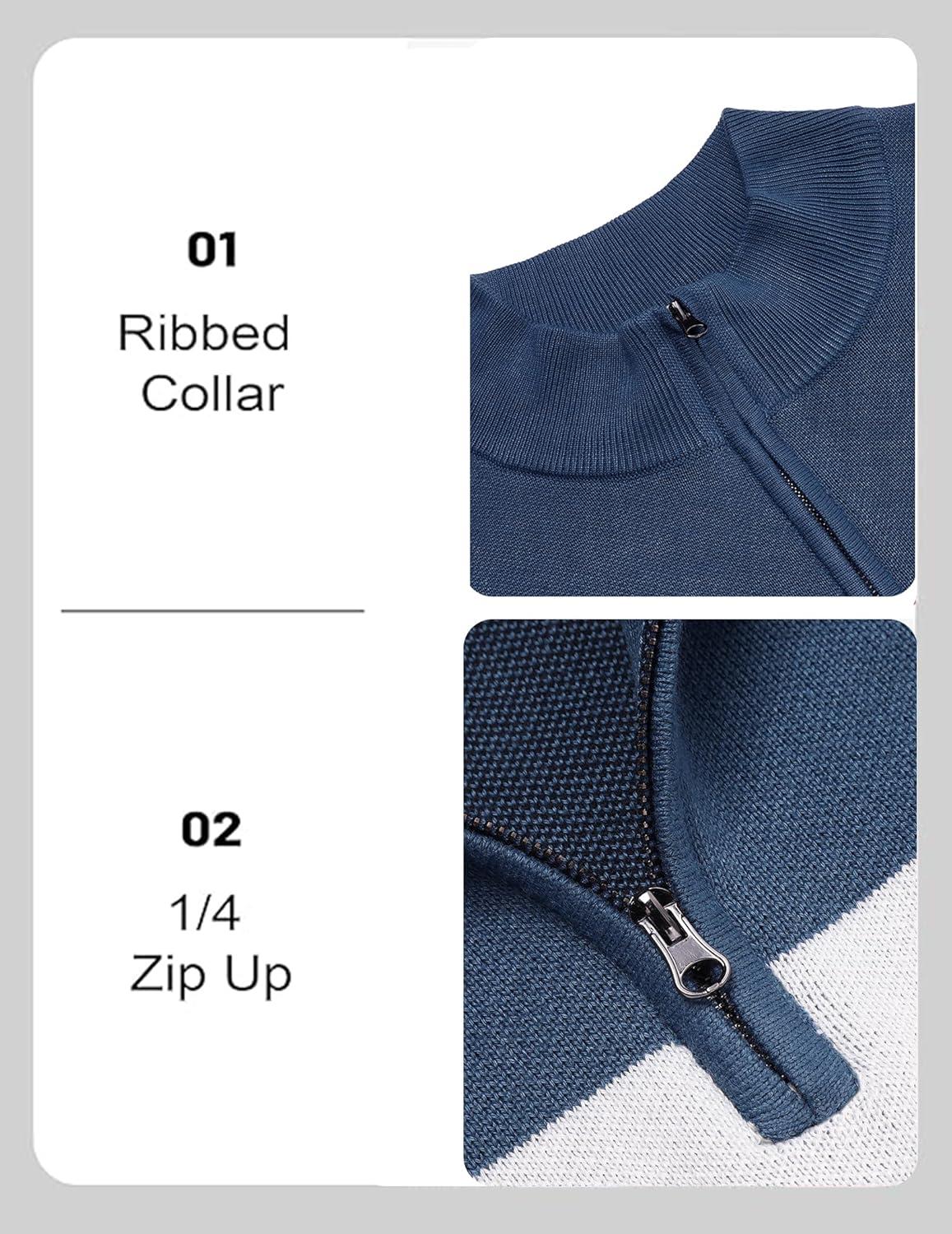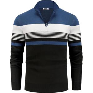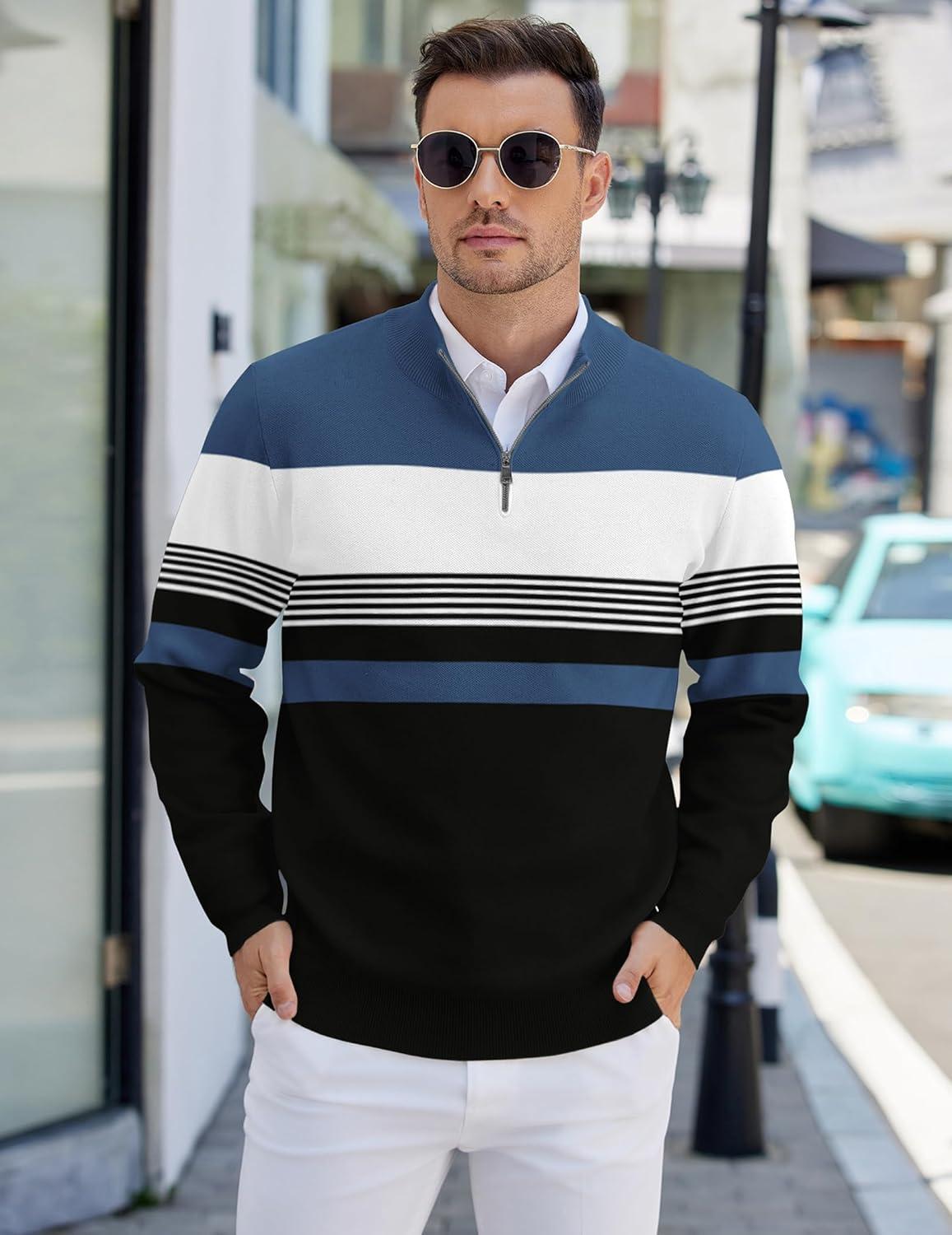 COOFANDY Mens Quarter Zip Pullover Slim Fit Lightweight Knit Pullover Sweaters Casual Polo Sweater(Stripe-blue&black&white)