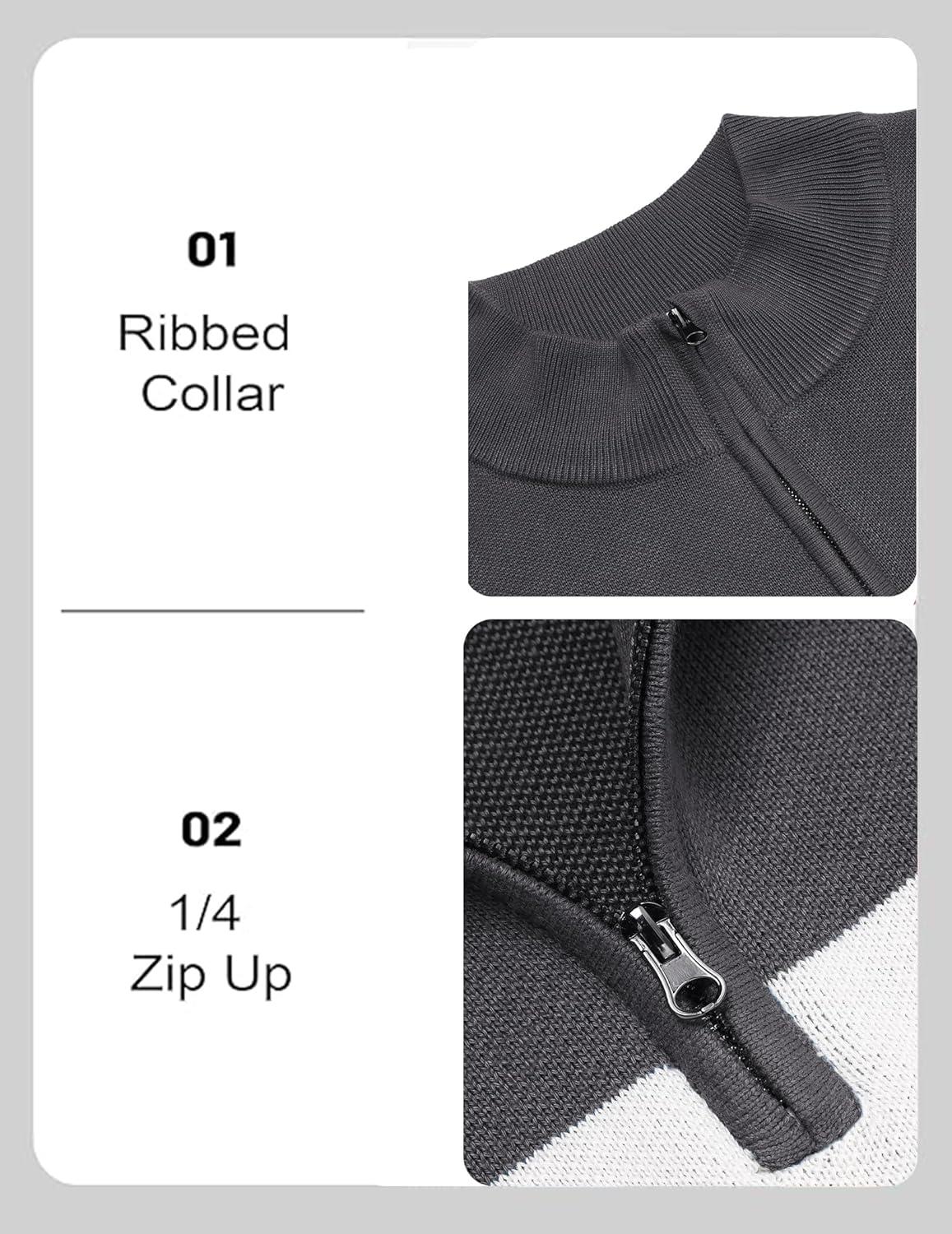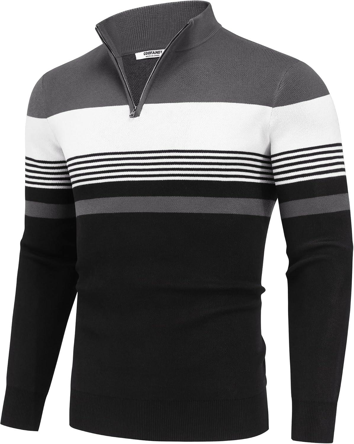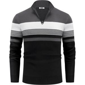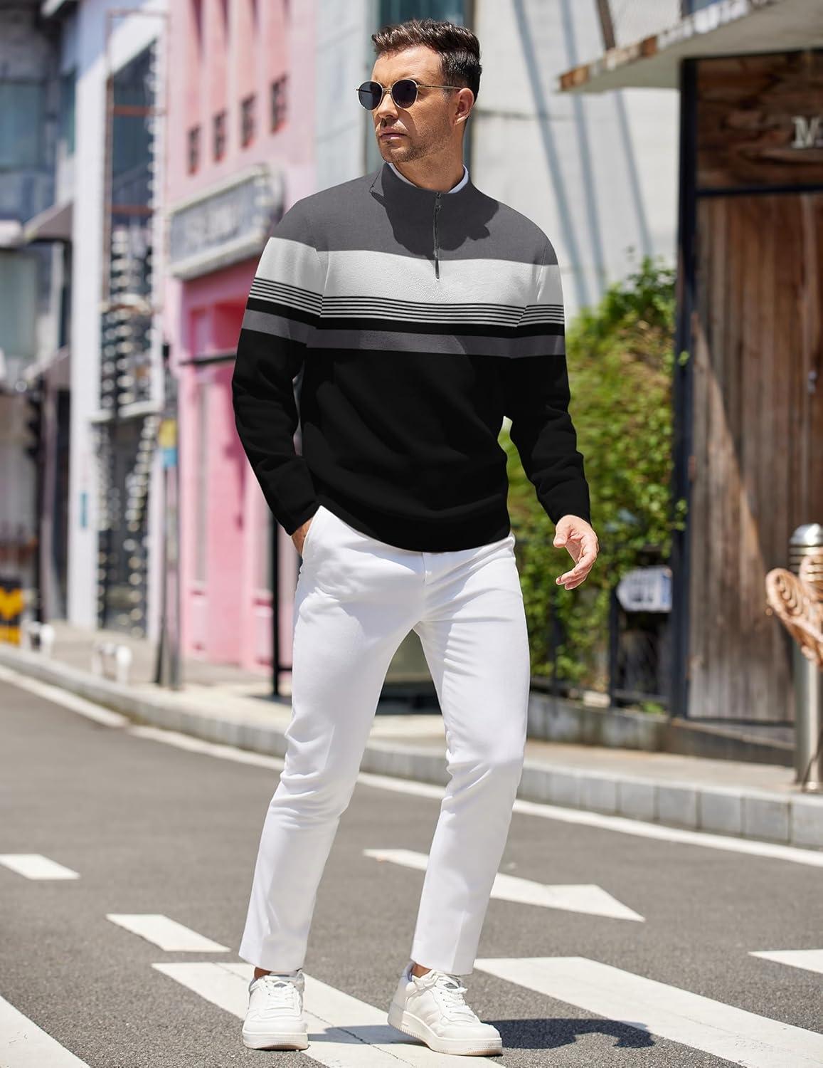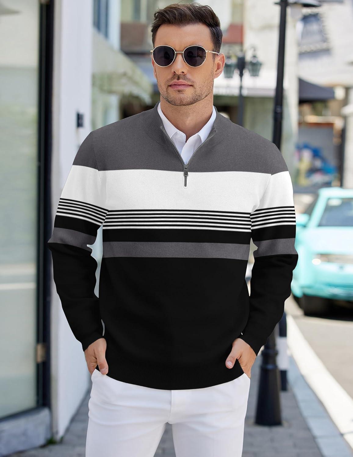 COOFANDY Mens Quarter Zip Pullover Slim Fit Lightweight Knit Pullover Sweaters Casual Polo Sweater(Stripe-grey&black&white)