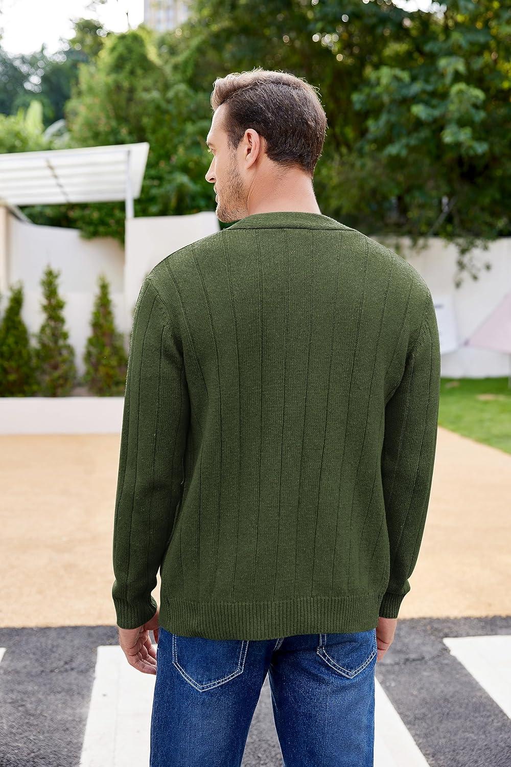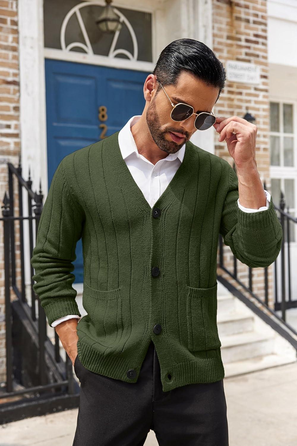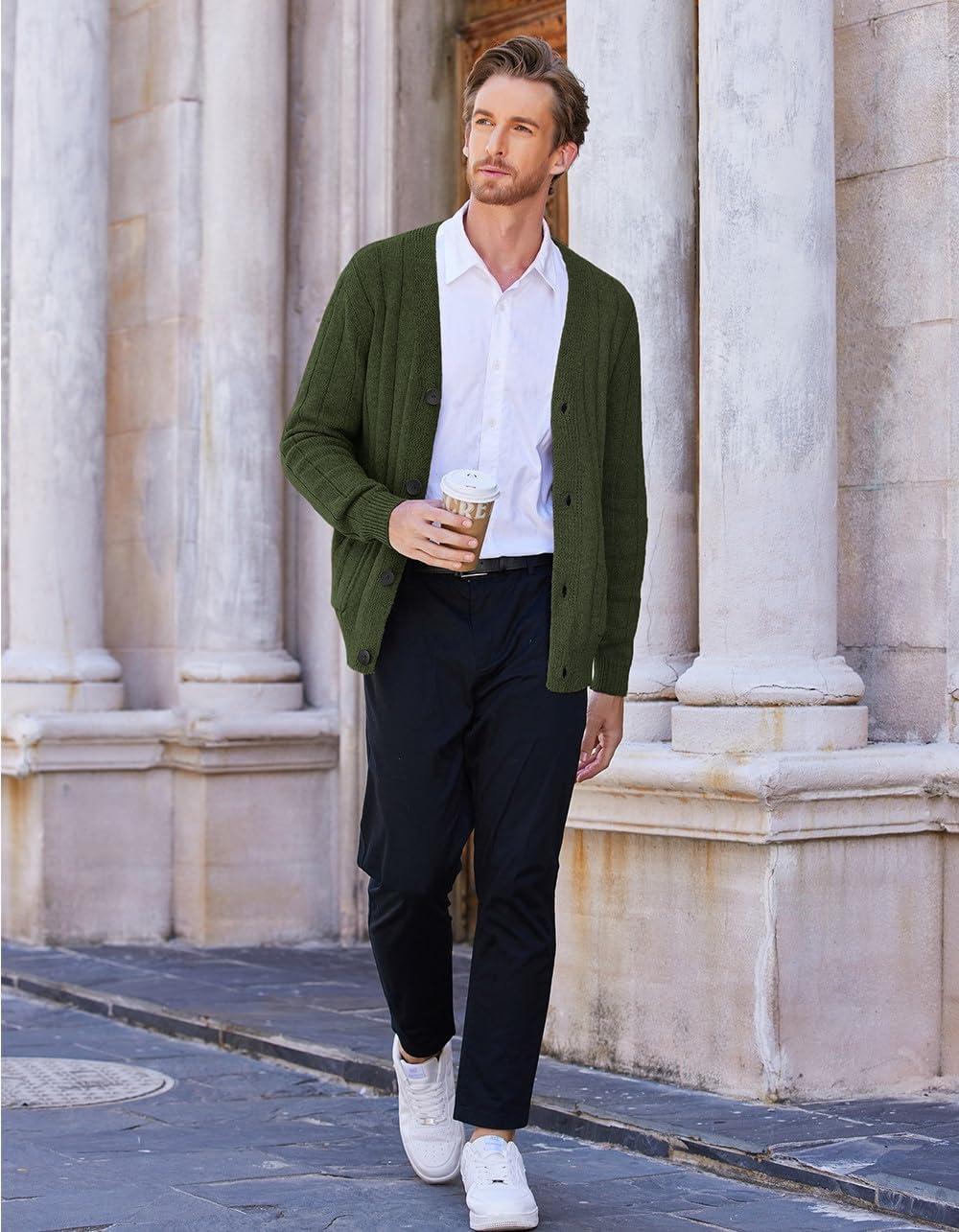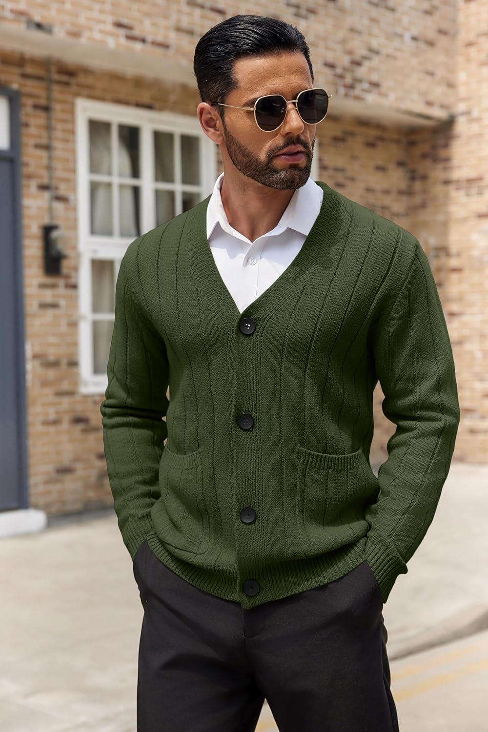COOFANDY Men’s Cardigan Sweater Cable Knit V Neck Button up Sweaters Ribbed Cardigan Sweater with Pockets(Army Green)