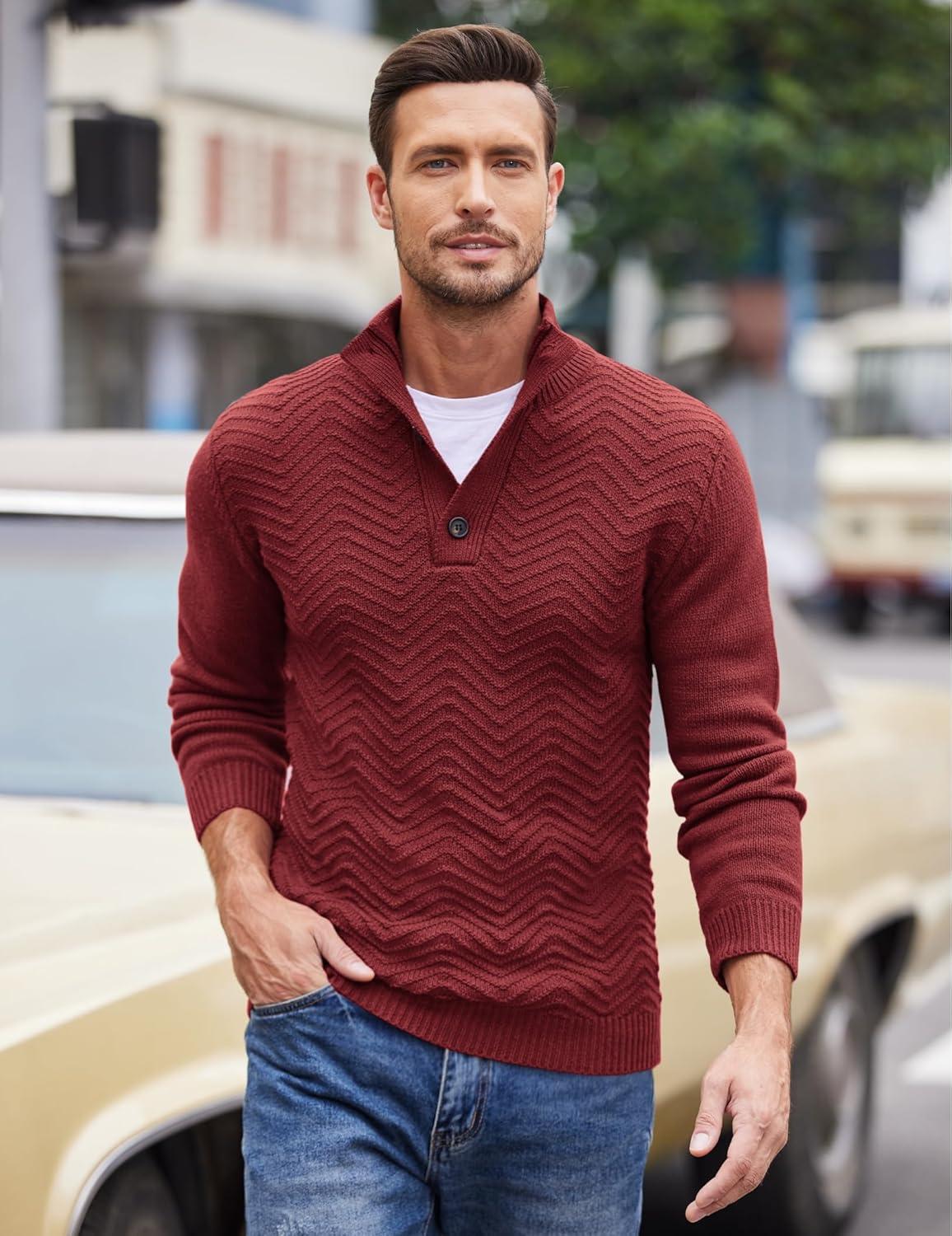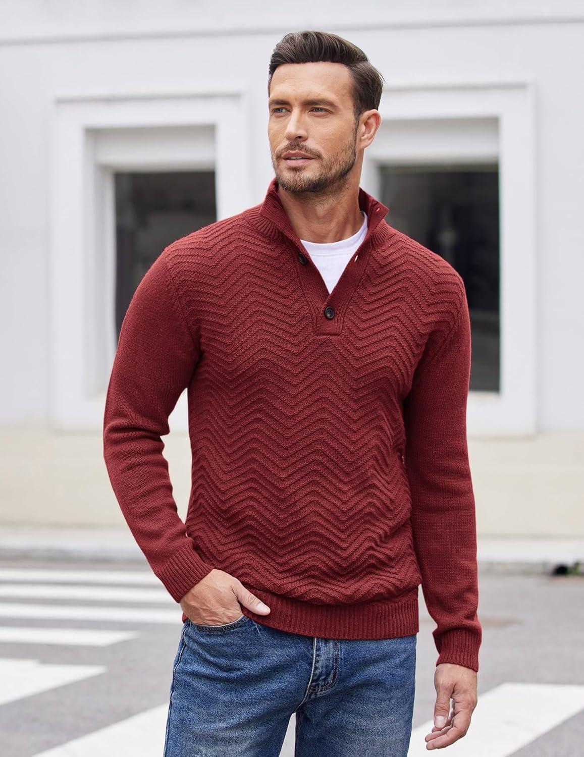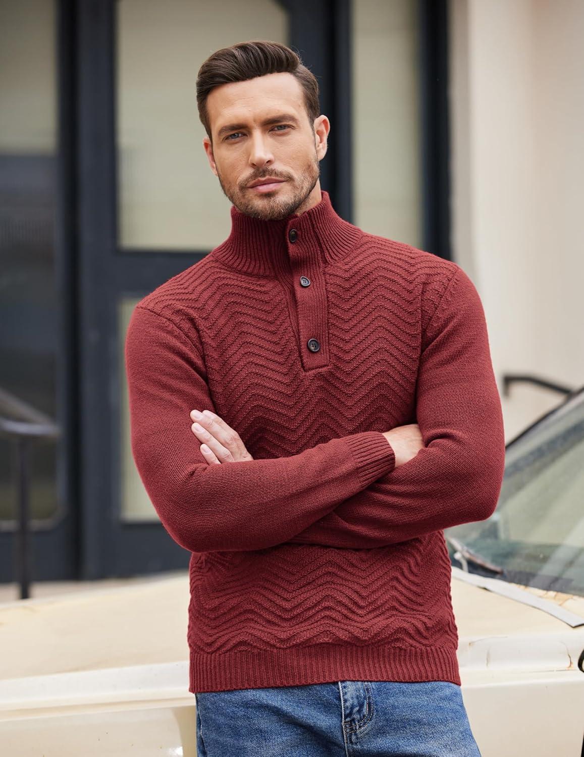 COOFANDY Men Quarter Button Sweater Pullover Cable Knit Henley Mock Neck Sweater(Wine Red)