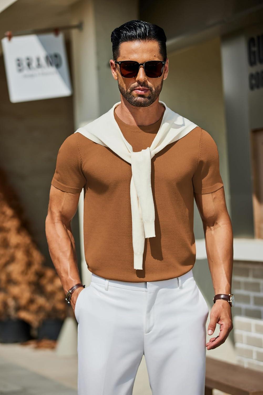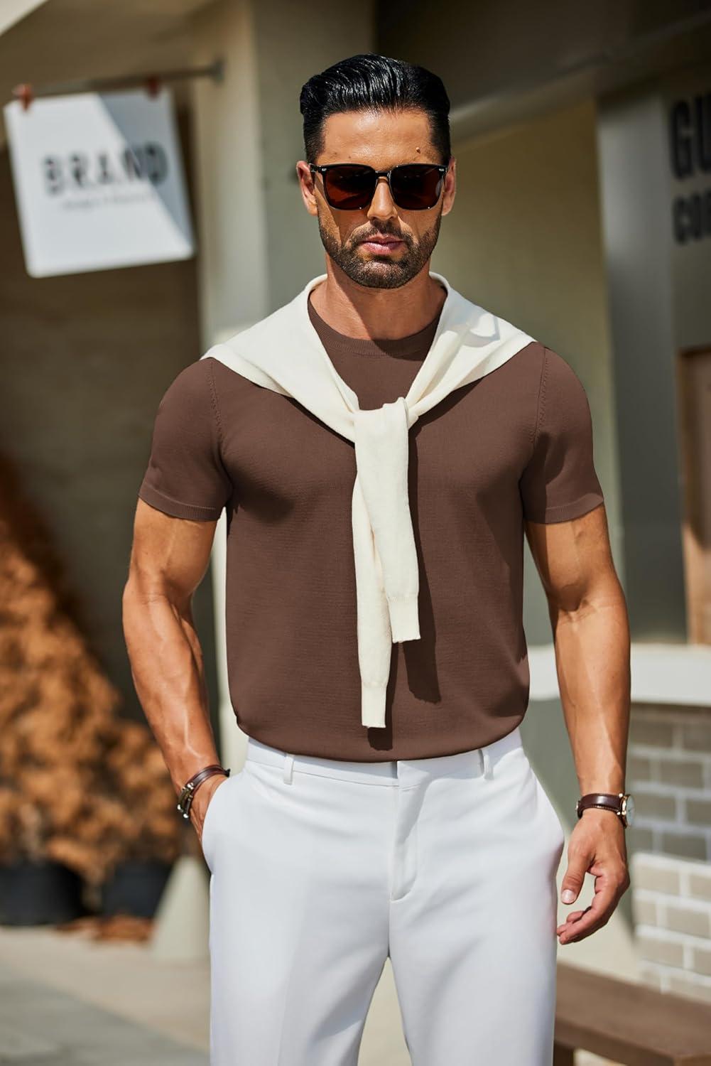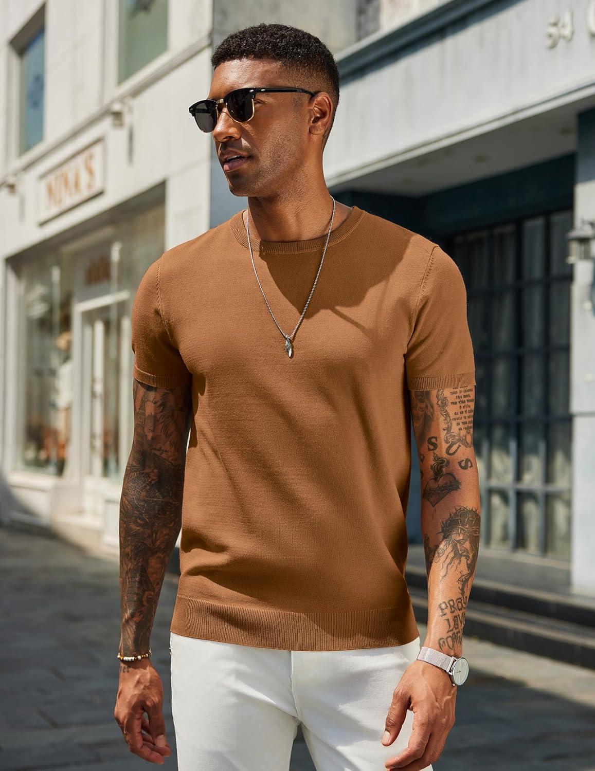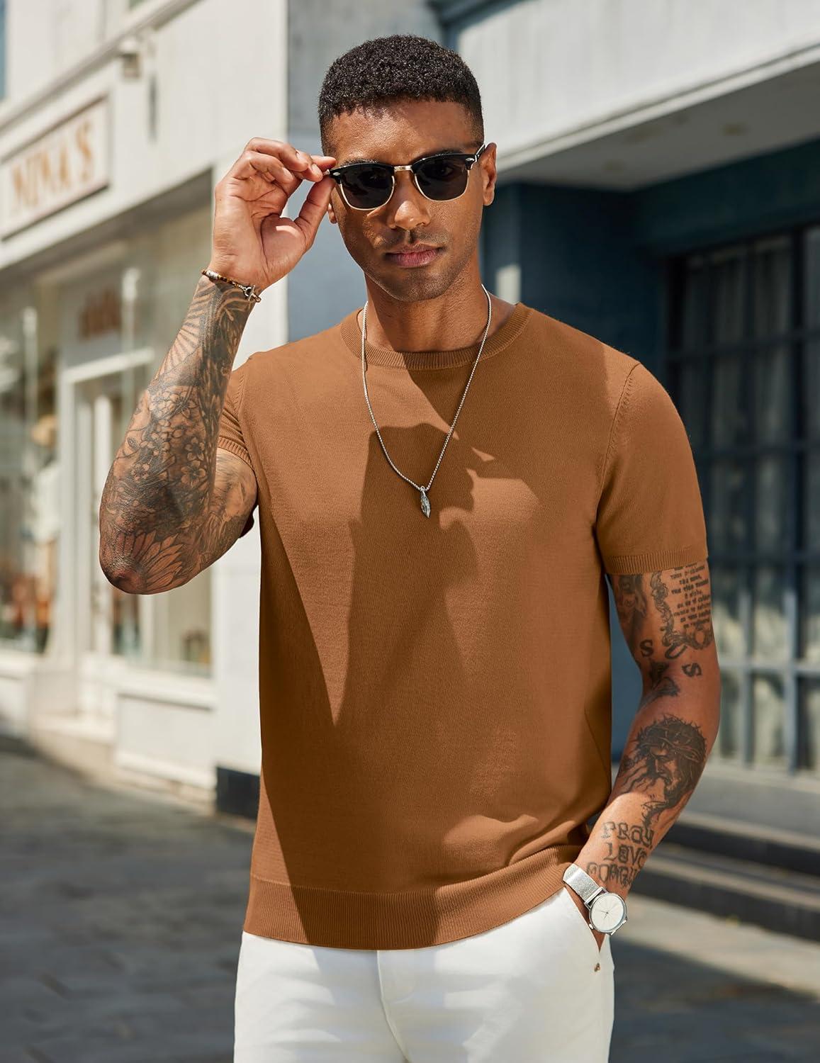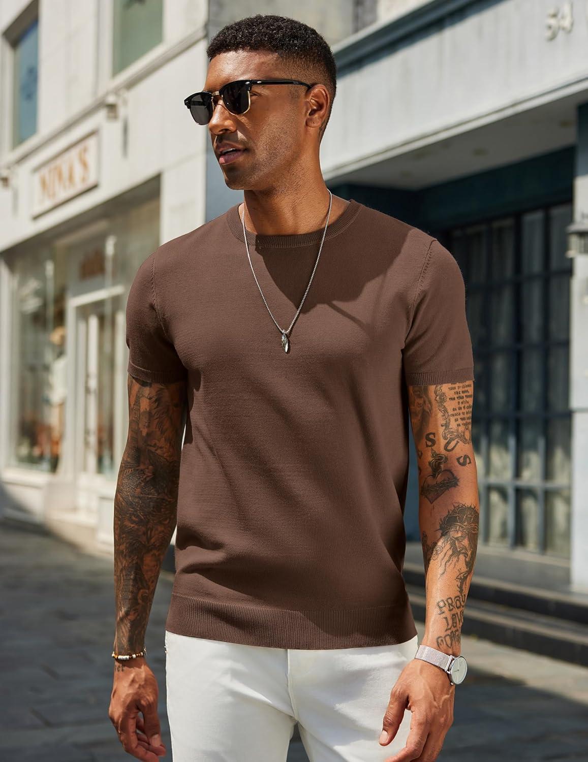 COOFANDY Men’s Crewneck Sweater Short Sleeve Casual Basic Tops Classic Fashion Knit Pullover Tees(Brown)